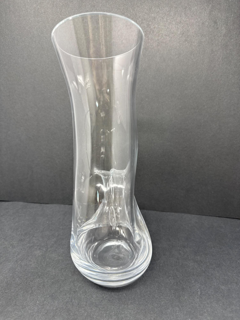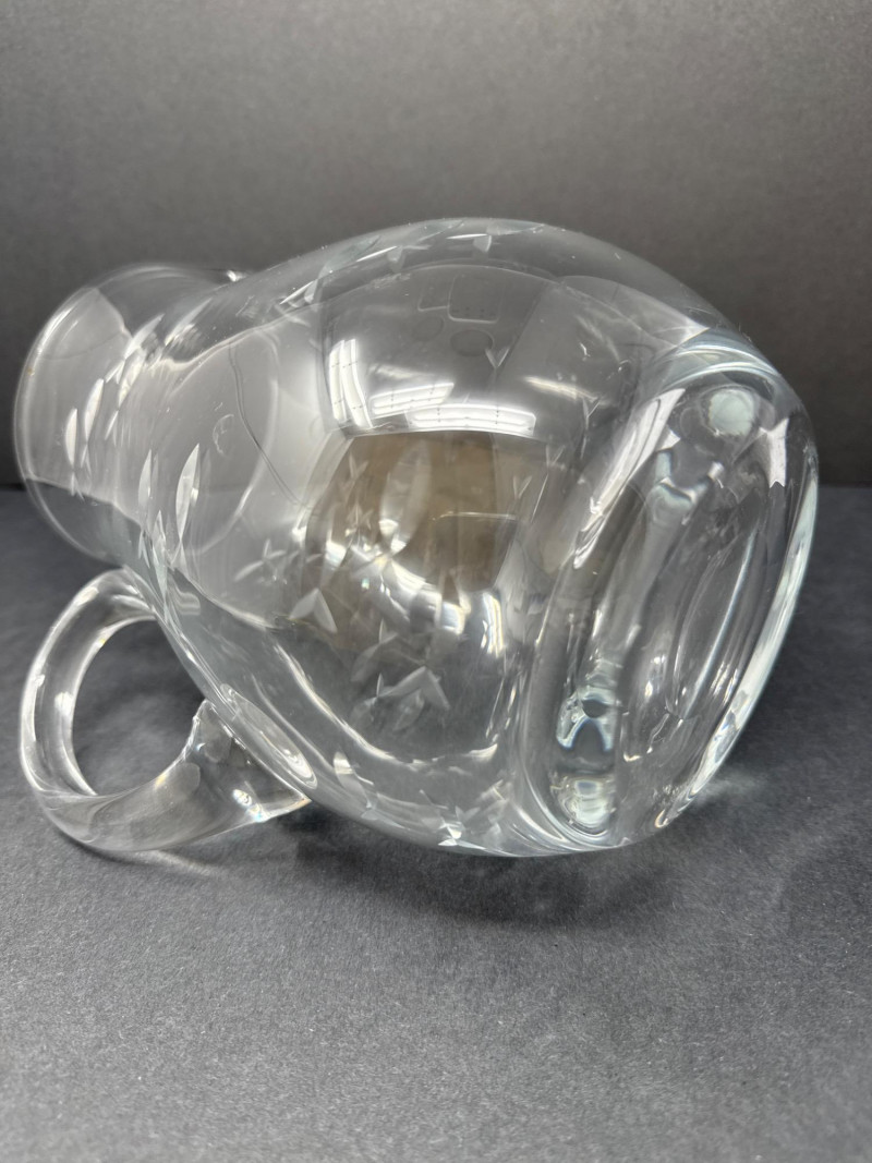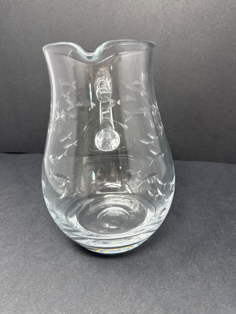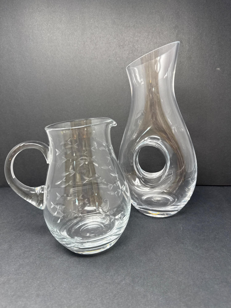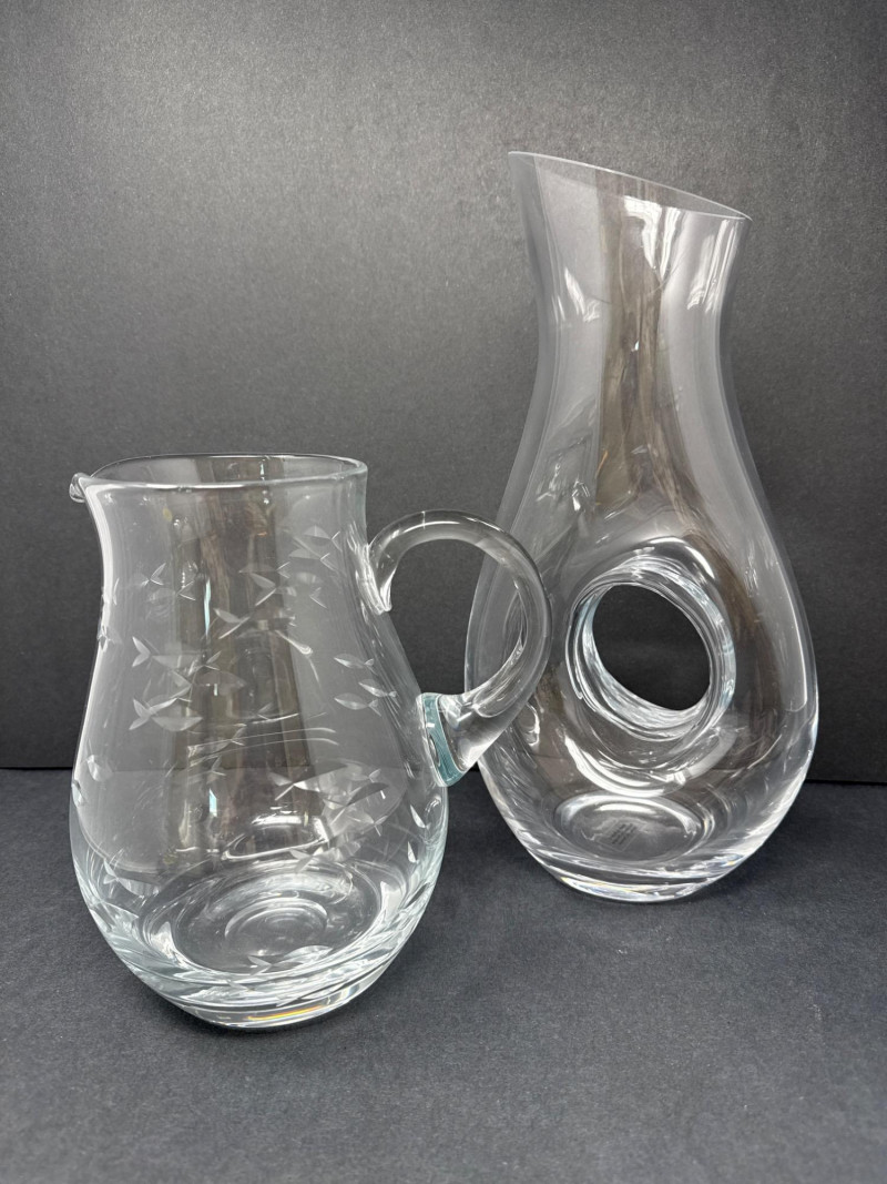 Dimensions: 8ʺ tall × 7ʺ wide Color: Clear Design: Hand-blown glass pitcher with a rounded body, polished base, and pinched spout. The body features a charming etched fish pattern—a stylized mid-century design that adds a touch of whimsy and coastal charm. Attribution: Unmarked; reminiscent of Princess House and Scandinavian etched glasswork. Style Notes: Ideal as a serving vessel or floral vase, this pitcher combines functional form with subtle marine-inspired artistry. Dimensions: 12.5ʺ tall × 6ʺ wide Color: Clear Design: Elegant modern glass carafe with a circular pierced handle opening and asymmetrical flared rim—widely associated with Bormioli Rocco, Italy. Unmarked but consistent with their design and craftsmanship. Function: Designed as a wine, juice, or water pitcher, yet equally striking as a sculptural centerpiece. The open hole allows for easy handling and adds a contemporary sculptural flair. Style Notes: Minimalist, fluid, and modern—balances perfectly with the organic etched form of its companion pitcher.Vintage Etched Glass Pitcher with Fish Motif