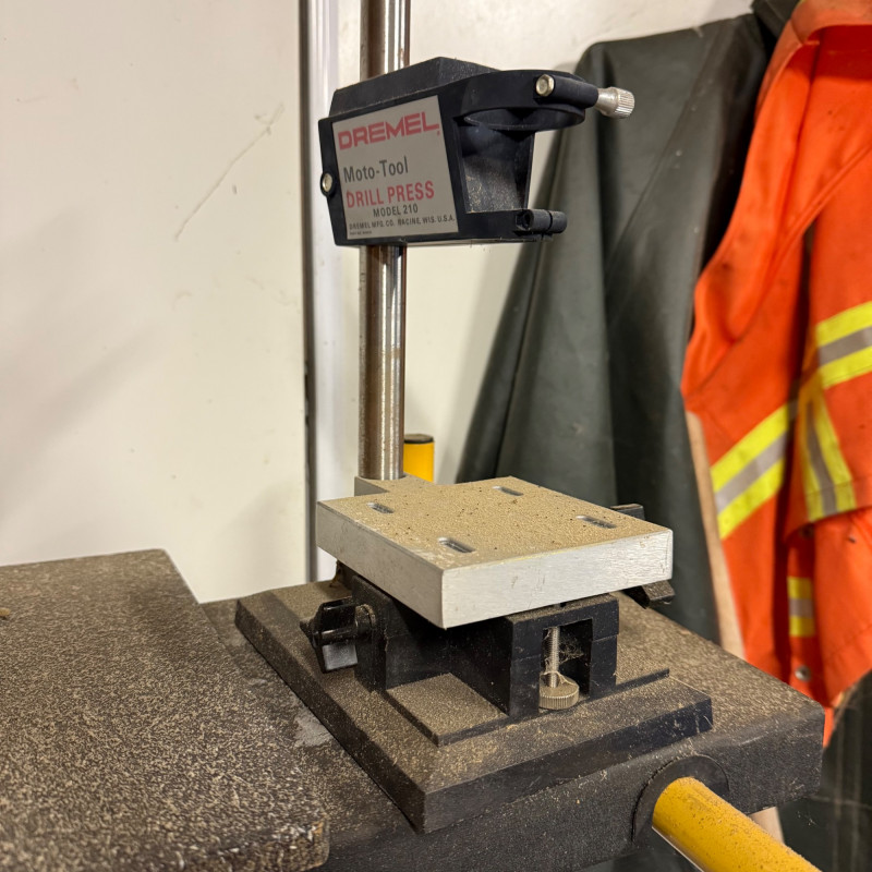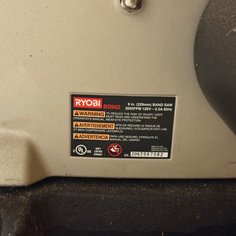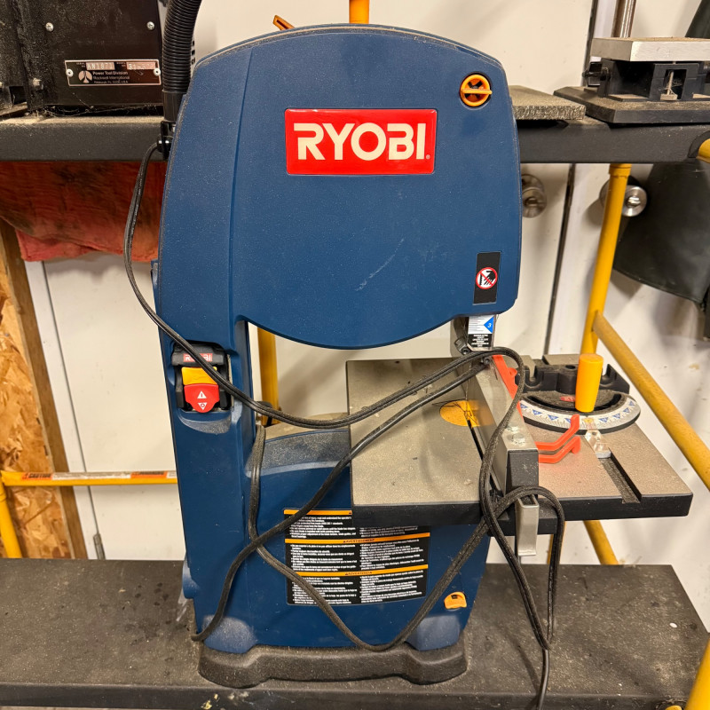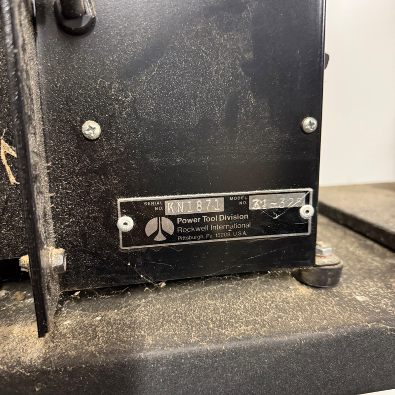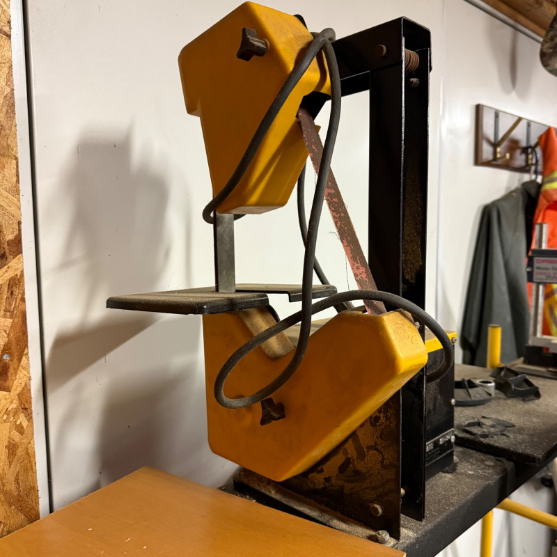 Dimensions: 24" tall × 14" wide × 10" deep Model / Power: BS902 – 9" (229 mm) band saw, 120V / 2.5A / 60Hz, 3000 FPM Design: Compact tabletop band saw with adjustable tilting table, precision blade guide, and safety paddle switch for steady operation. Origin: Ryobi Power Tools, made in China Style Notes: A reliable and smooth-running saw ideal for curved or straight wood cuts—perfect for hobbyists, model makers, and small workshop users. Dimensions: Approx. 40" tall × 13" wide × 10–16" deep Model / Serial: Model 31-322, Serial No. KN1871 – Rockwell International, Power Tool Division, Pittsburgh, PA, U.S.A. Design: Heavy-duty vertical belt sander with durable cast frame, adjustable platform, and industrial-grade performance for shaping and smoothing wood or metal. Style Notes: A vintage American-made Rockwell tool admired for its longevity, consistent power, and collectible industrial design. Dimensions: Approx. 12" tall × 7" base width Design: Compact adjustable drill press stand compatible with Dremel rotary tools. Ideal for small-scale drilling, engraving, and polishing projects. Style Notes: A precision accessory for craftspeople and model builders requiring fine control and accuracy. Rack Dimensions: 49.5” tall × 43” wide × 21” deep Design: Two-shelf rolling scaffold rack with yellow steel frame, offering portability and organized workspace for the tool set.Ryobi BS902 9” Band Saw