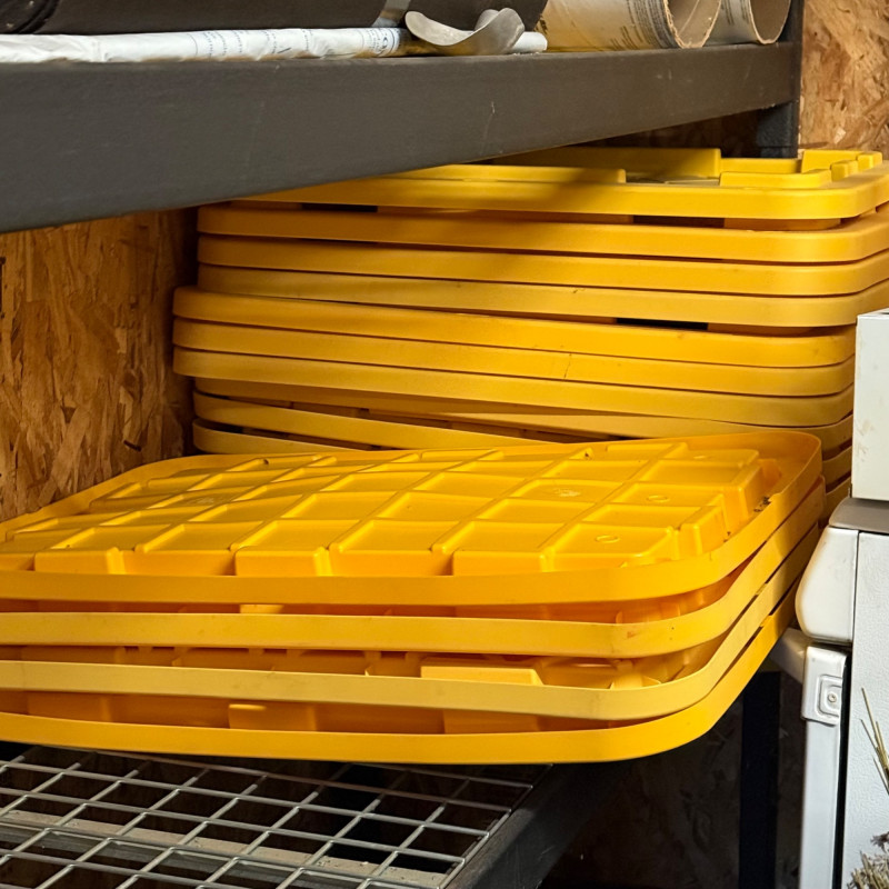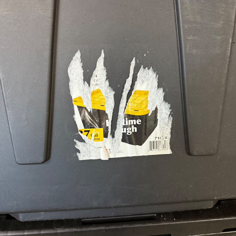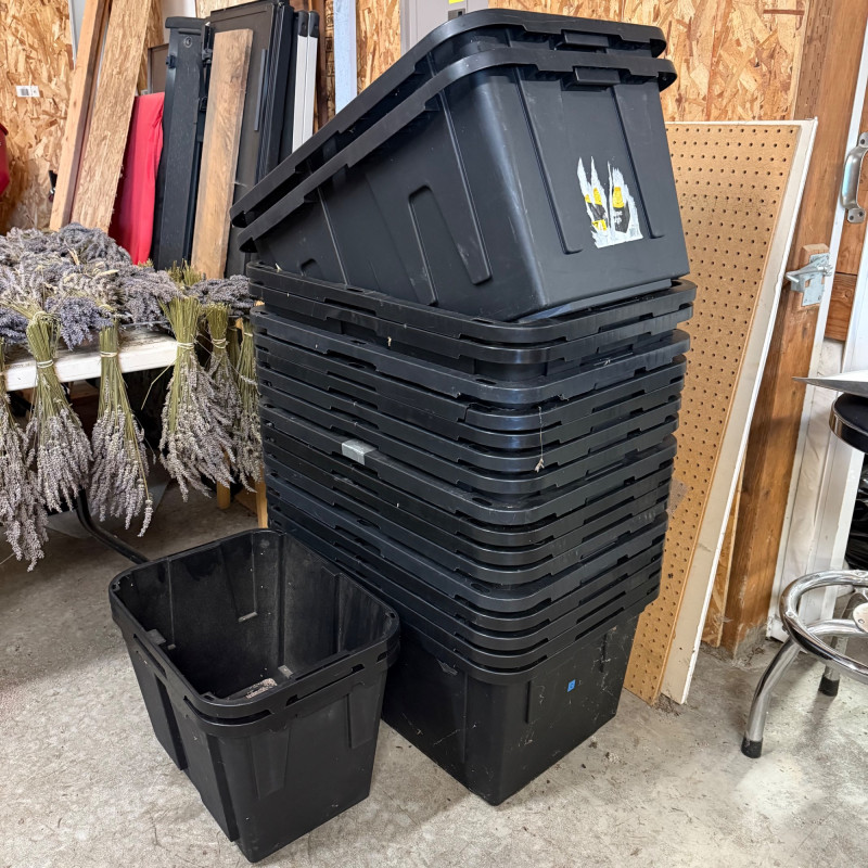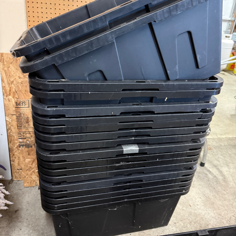 Lot includes 18 large heavy-duty 27-gallon black plastic storage totes with matching yellow lids, plus 2 smaller totes without lids. These rugged containers are ideal for organizing tools, supplies, or seasonal items in a garage, warehouse, or workshop setting. Each tote features reinforced construction, molded hand grips, and a stackable design for efficient storage and transport.