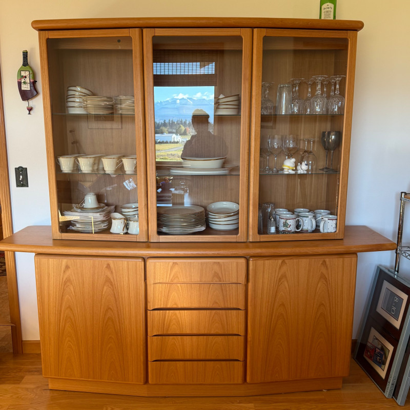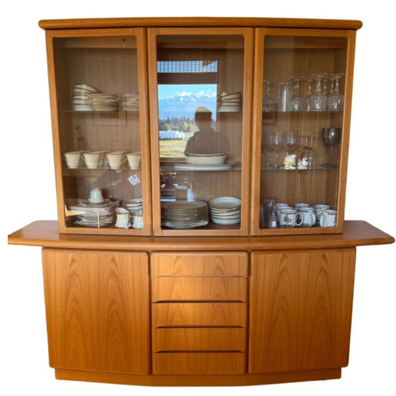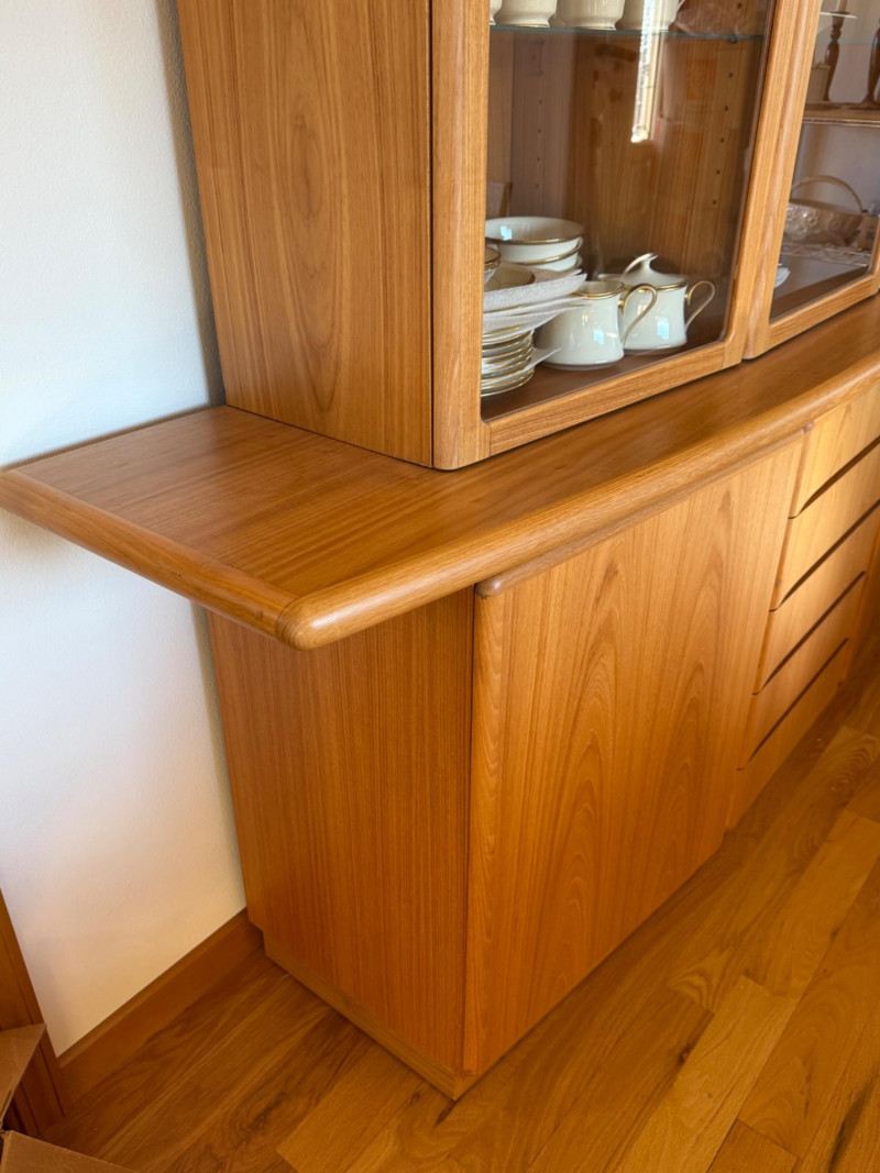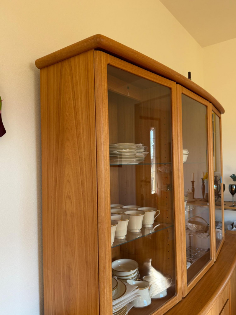 Elegant mid-to-late 20th century Danish modern hutch by Skovby Møbelfabrik, model RS26T, crafted from solid and veneered teak wood. This fine-quality cabinet features clean Scandinavian lines, a smooth lacquered finish, and Skovby’s hallmark curved profile and rounded edge detailing. The upper hutch includes three glass-front display sections with adjustable glass shelving and interior lighting (wiring visible underneath). The lower credenza offers ample concealed storage with four central drawers and two side cabinets with adjustable interior shelving—ideal for linens, serveware, or barware. Design Features: Model: RS26T Material: Genuine Teak Finish: Warm honey-toned satin finish Configuration: Three glass doors above; drawers and cabinets below Origin: Made in Denmark (Skovby label intact) Hardware: Concealed European hinges Condition Note: Collecting Note:
