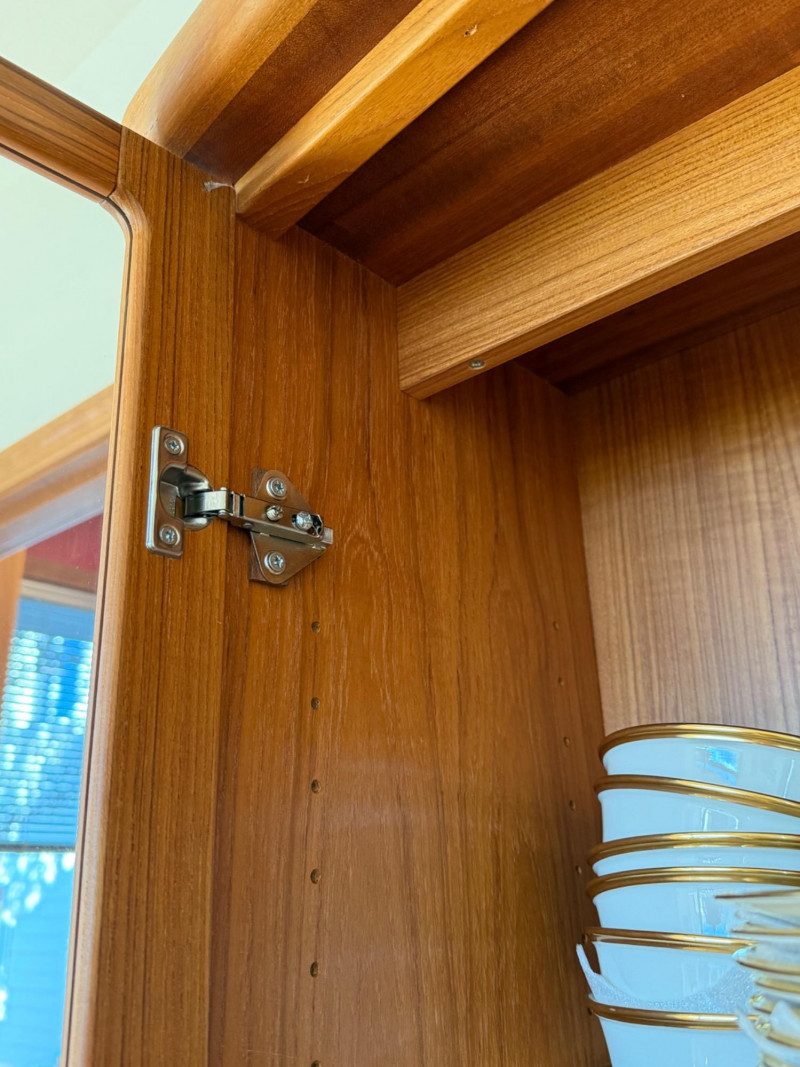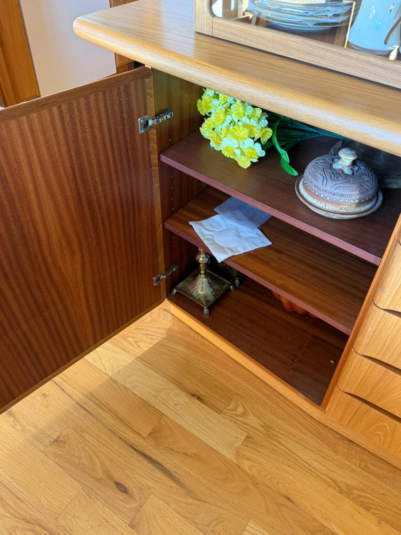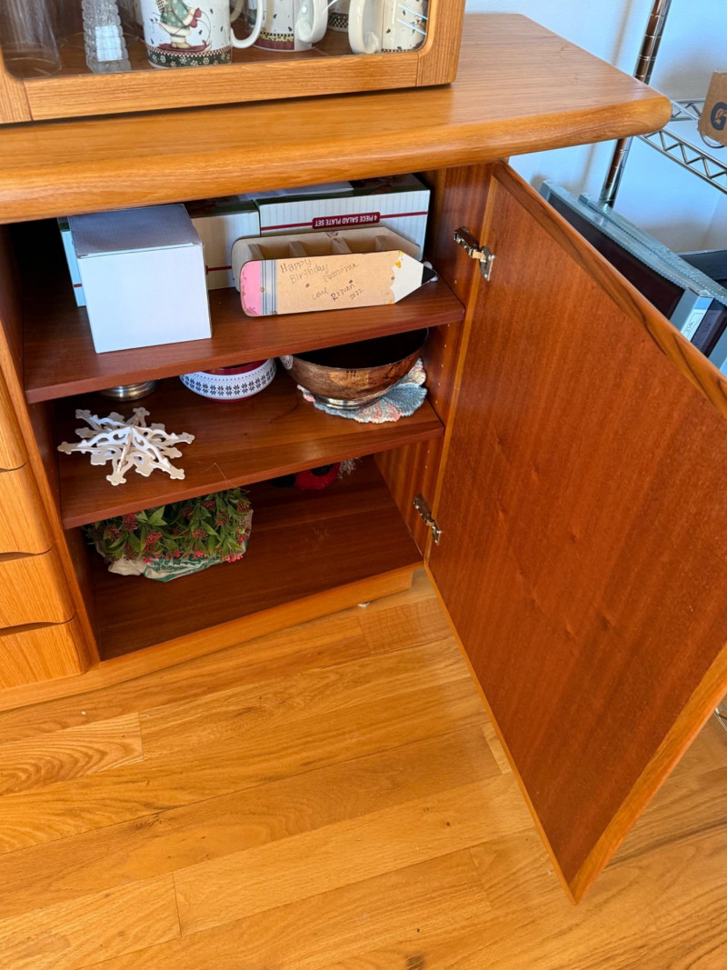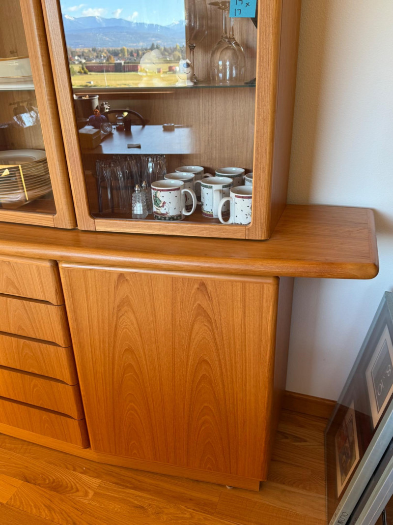 Elegant mid-to-late 20th century Danish modern hutch by Skovby Møbelfabrik, model RS26T, crafted from solid and veneered teak wood. This fine-quality cabinet features clean Scandinavian lines, a smooth lacquered finish, and Skovby’s hallmark curved profile and rounded edge detailing. The upper hutch includes three glass-front display sections with adjustable glass shelving and interior lighting (wiring visible underneath). The lower credenza offers ample concealed storage with four central drawers and two side cabinets with adjustable interior shelving—ideal for linens, serveware, or barware. Design Features: Model: RS26T Material: Genuine Teak Finish: Warm honey-toned satin finish Configuration: Three glass doors above; drawers and cabinets below Origin: Made in Denmark (Skovby label intact) Hardware: Concealed European hinges Condition Note: Collecting Note: