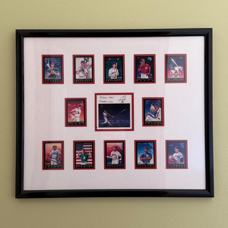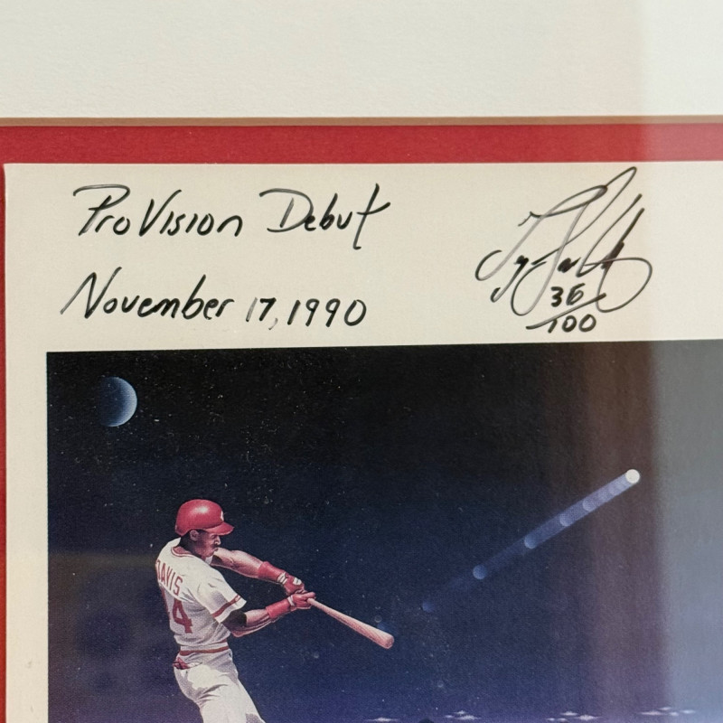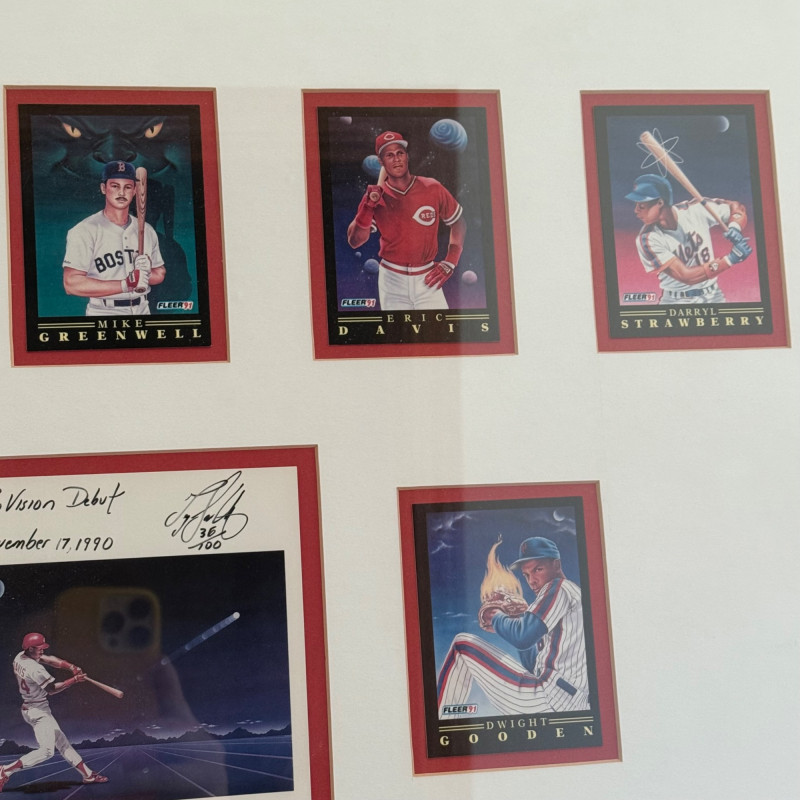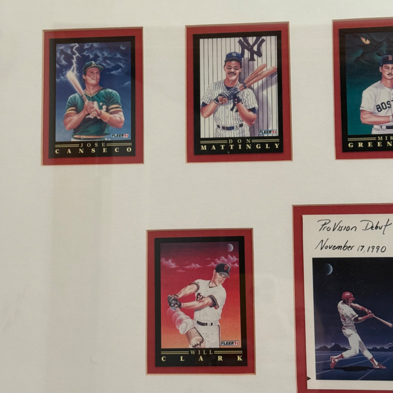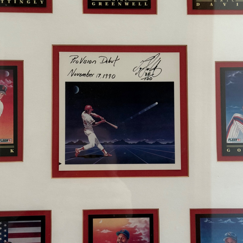 A rare limited edition framed presentation of the iconic Fleer ProVision baseball card series, designed and illustrated by sports artist Terry Smith. This collector’s display includes twelve vibrant Fleer ’91 ProVision cards featuring baseball legends such as Jose Canseco, Don Mattingly, Mike Greenwell, Eric Davis, Darryl Strawberry, Dwight Gooden, Will Clark, Ruben Sierra, Mark McGwire, Bo Jackson, Roger Clemens, and others — arranged around a signed and numbered centerpiece print commemorating the series’ debut. At the center is the artist-signed print titled “ProVision Debut – November 17, 1990”, marked 36/100, showcasing Smith’s distinctive surrealist sports style with luminous, cosmic backgrounds that became a hallmark of early 1990s Fleer ProVision artwork. Artist: Terry Smith Collecting Note: