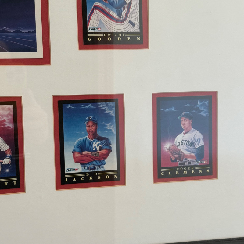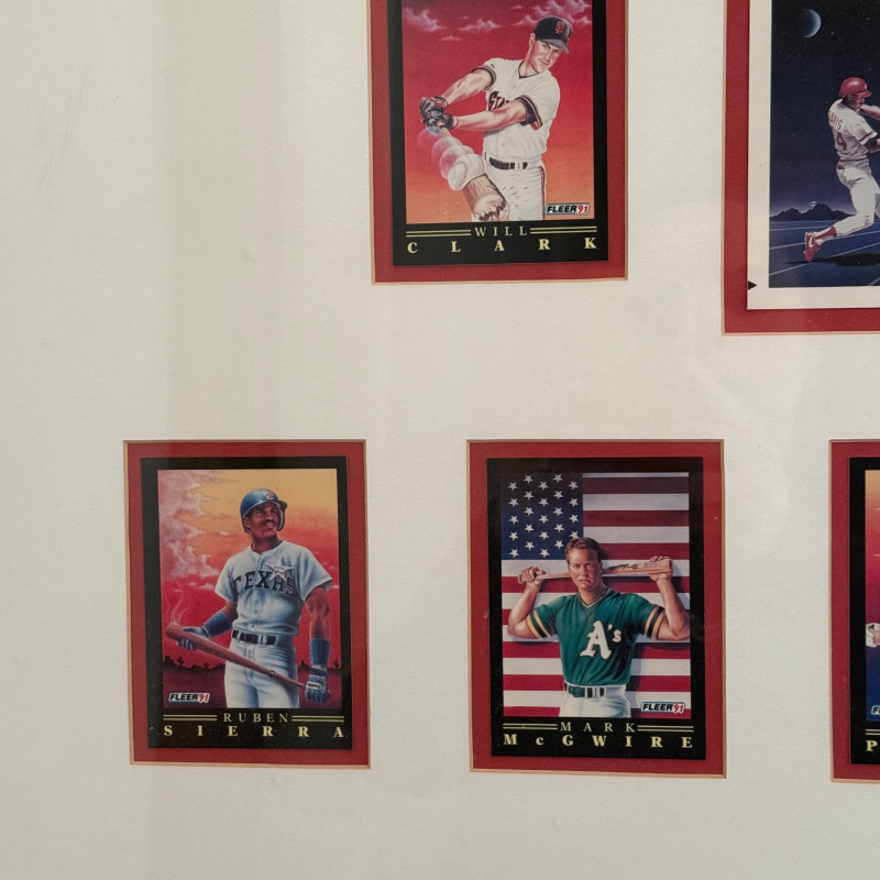 Terry Smith’s Fleer ProVision illustrations are among the most recognizable crossover works between fine art and sports memorabilia from the early 1990s. Limited to only 100 signed editions, this framed set is a museum-quality presentation that celebrates both the artistry and athleticism of baseball’s golden era — featuring some of the decade’s biggest names, including Bo Jackson, Roger Clemens, and Mark McGwire.