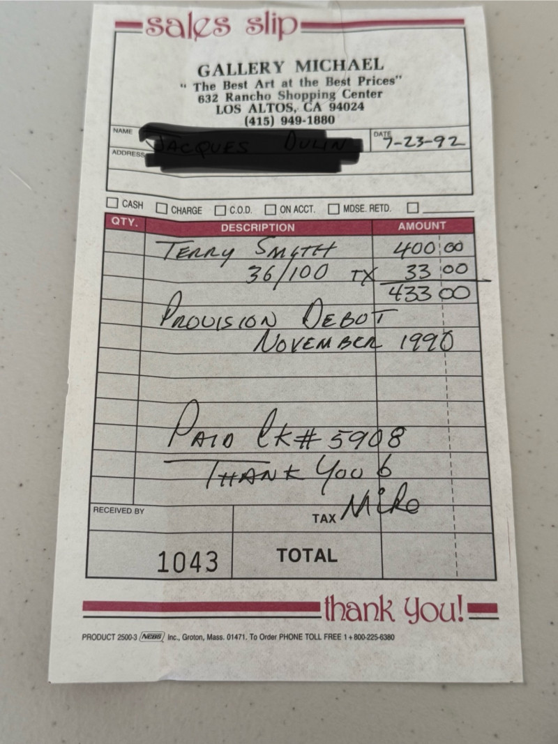 Documentation: Includes original 1992 sales slip from Gallery Michael (Los Altos, California) noting the title “ProVision Debut, November 1990” and sale to collector Jacques Dulin for $433.