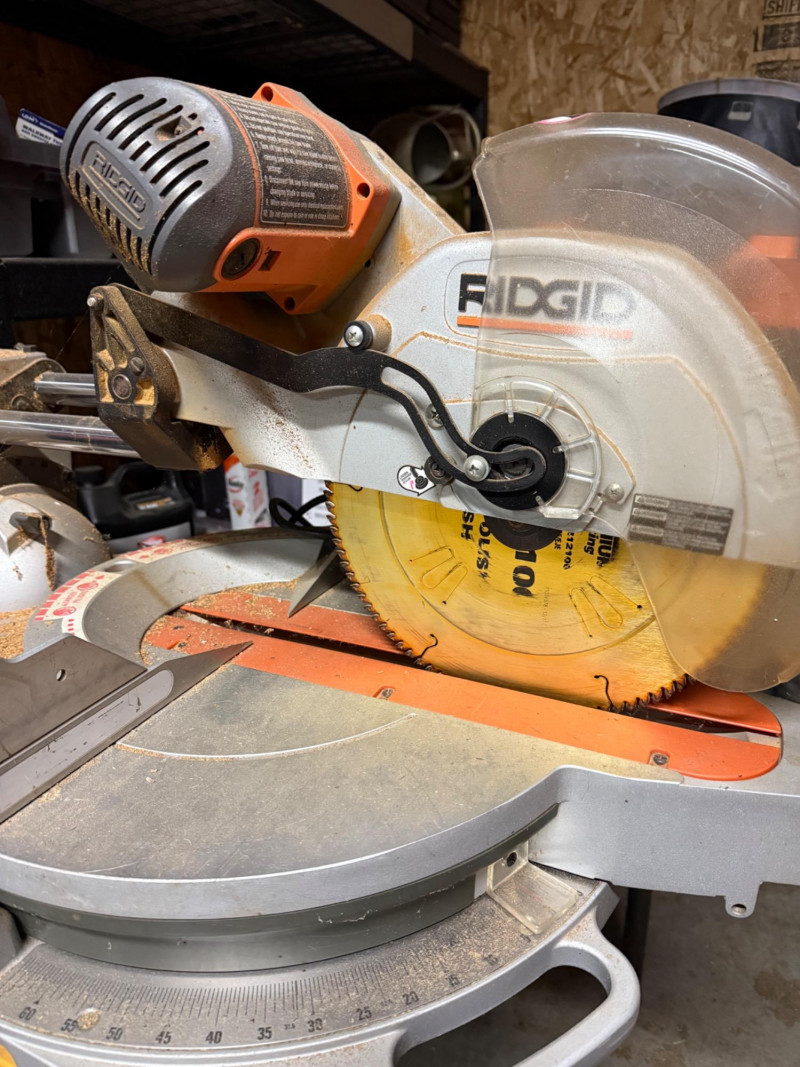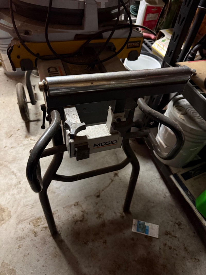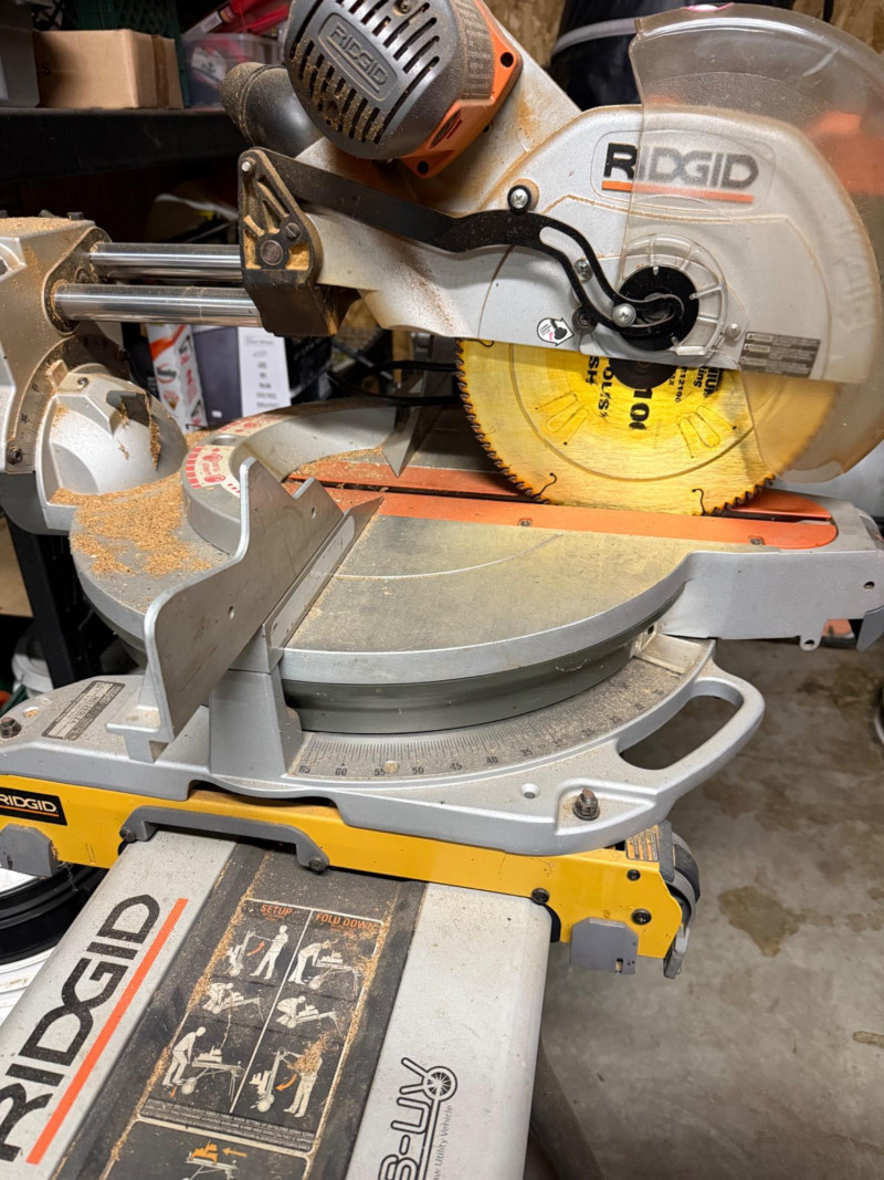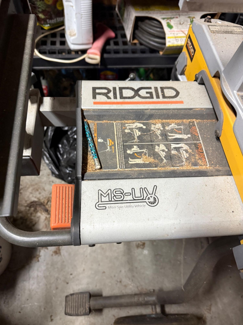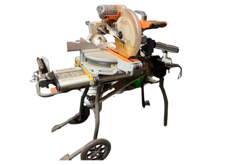Professional-grade RIDGID 12-inch Dual Bevel Sliding Compound Miter Saw mounted on the RIDGID MS-UV (Miter Saw Utility Vehicle) rolling stand. This setup combines precision cutting capability with convenient portability, ideal for contractors, woodworkers, and serious DIYers. Details: Brand: RIDGID Model: 12” Dual Bevel Sliding Compound Miter Saw Stand: RIDGID MS-UV Miter Saw Utility Vehicle with foldable design and large wheels for transport Blade Size: 12 inches (installed) Features: Dual bevel capability for angled cuts Sliding arm for wider boards Integrated laser guide for precision alignment Adjustable miter and bevel scales Quick-release mounting brackets Heavy-duty construction with ergonomic handles Dimensions (approx.): 38” H × 30” W × 60” L (when fully extended) Notes: Handling Note: