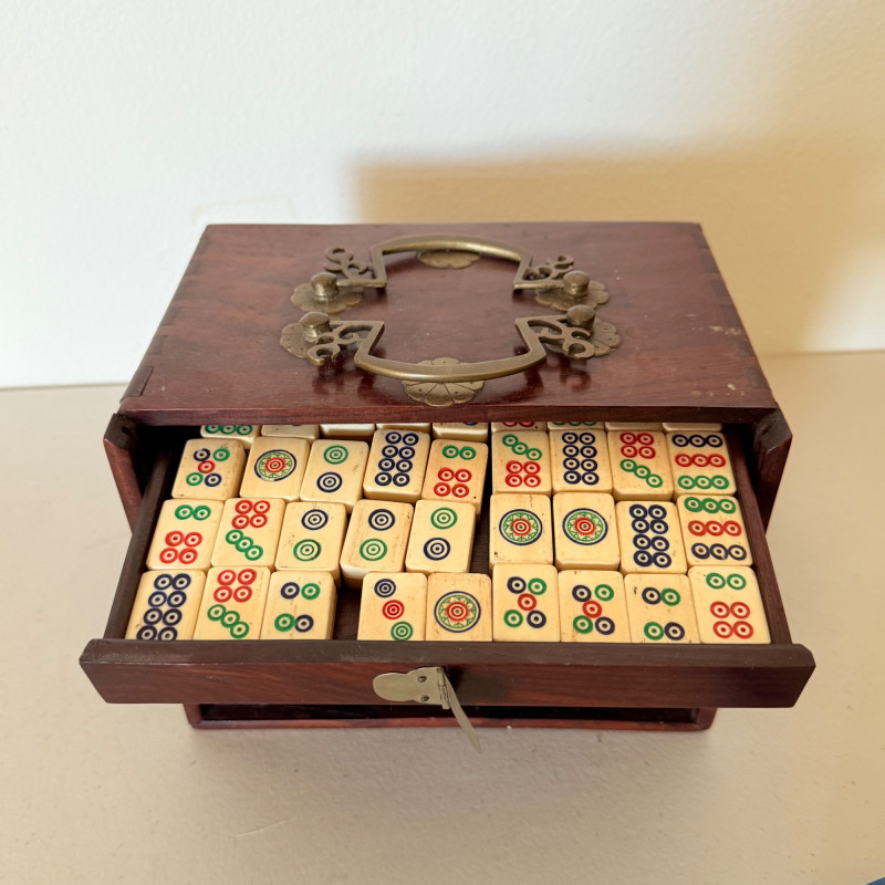 A beautifully crafted antique Mahjong set featuring hand-carved bone-and-bamboo tiles housed in a traditional hardwood case with ornate brass fittings. Each tile displays classic circle, bamboo, and character motifs in red, green, and blue — carefully engraved and hand-painted with rich detail. The set reflects early 20th-century Chinese craftsmanship, produced during the 1920s–1940s when bone-and-bamboo Mahjong sets were made for both domestic use and export. Materials: Bone and bamboo tiles; hardwood case with brass hardware Dimensions: Box measures approximately 6” H × 8” W × 5.5” D; tiles measure 1” × ¾” each Details: Hand-carved and ink-filled tiles stored in sliding drawers; brass handle and latch with decorative floral motifs Authenticity Note: The layered bone-and-bamboo construction, hand-engraved designs, and handmade brass fittings are indicative of authentic early 20th-century Chinese Mahjong sets, preceding the mid-century plastic reproductions.