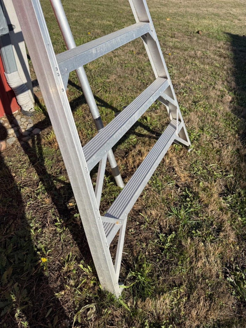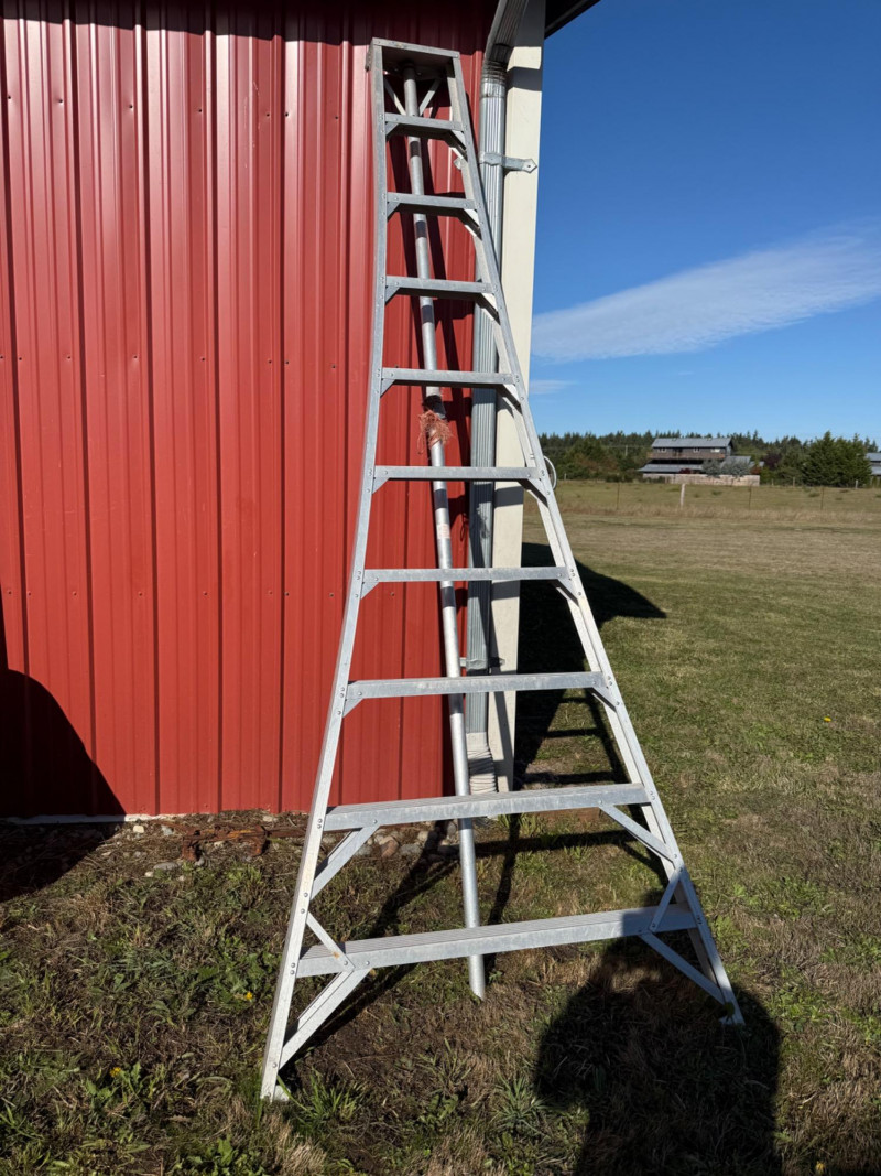 A sturdy and lightweight 10-foot aluminum orchard ladder, ideal for farm, garden, and orchard use. This classic tripod-style ladder provides excellent stability on uneven terrain, with wide flared legs and reinforced bracing for secure footing. Constructed from durable, rust-resistant aluminum, it’s designed to withstand outdoor conditions while remaining easy to transport and maneuver. Features: Approx. 10 feet tall Lightweight yet strong aluminum frame Wide stance and flared base for stability Triangular support leg for balance on uneven ground Ideal for tree pruning, fruit picking, or outdoor maintenance Handling Note: