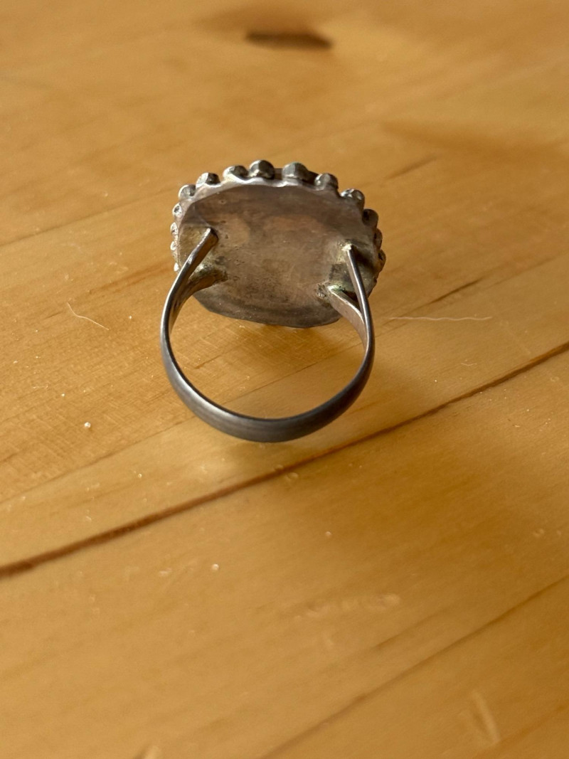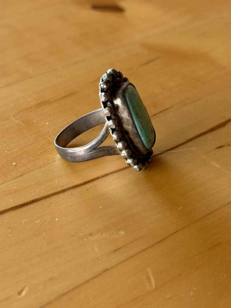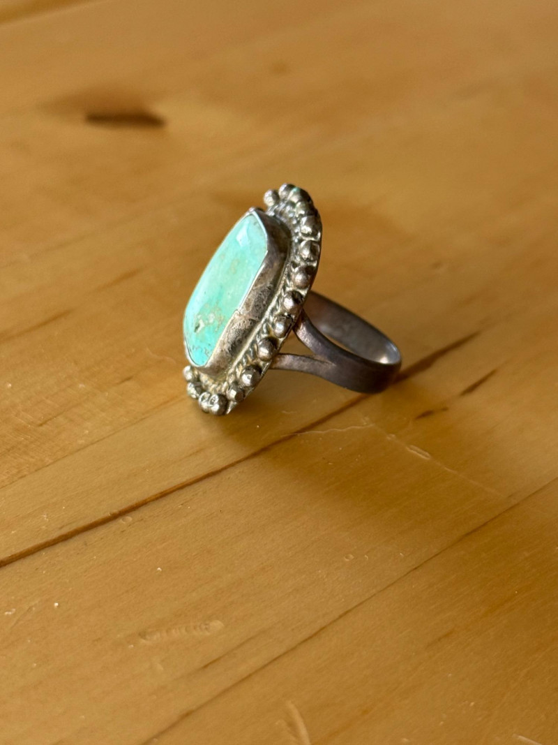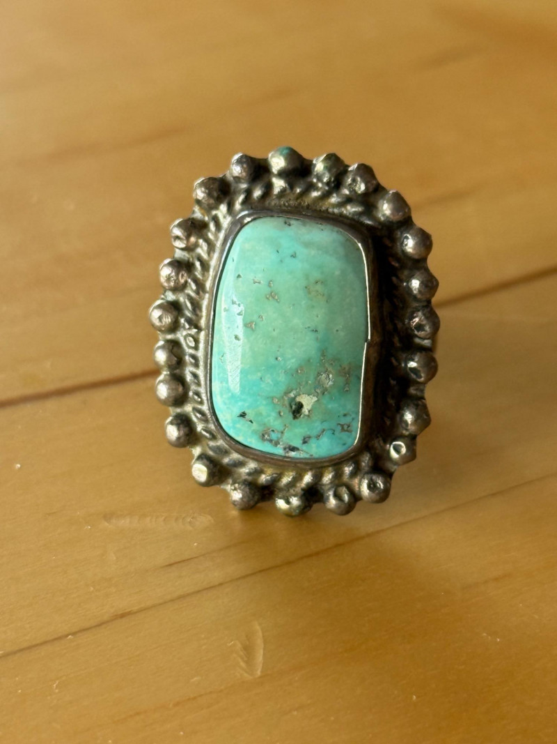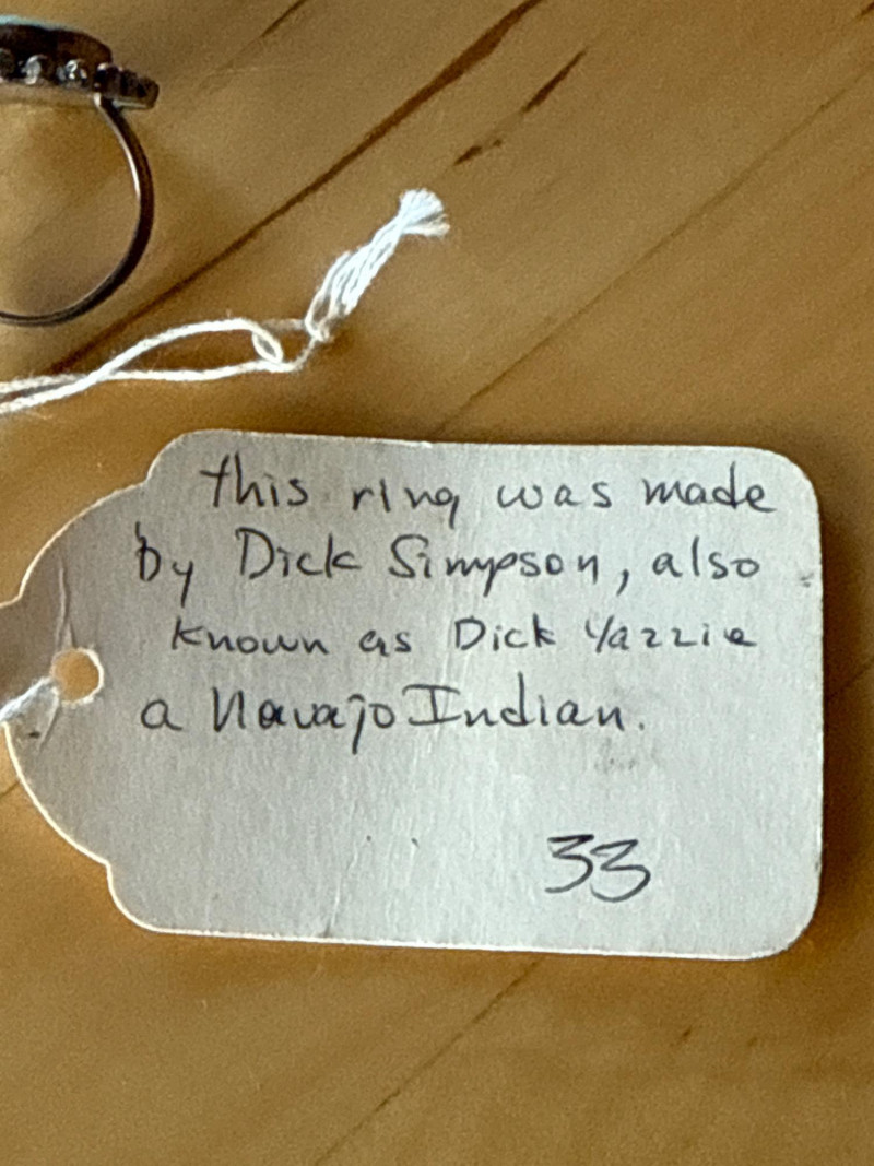 A striking hand-crafted Navajo ring featuring a natural rectangular turquoise stone set in a bold sterling silver bezel with a decorative beaded border. The turquoise displays natural matrix and color variations characteristic of Southwestern stones. The wide split shank adds both comfort and presence on the finger. Accompanied by a handwritten tag identifying the maker as Dick Simpson, also known as Dick Yazzie, a Navajo silversmith known for traditional turquoise jewelry. The ring is unsigned, but consistent with mid-20th-century Navajo craftsmanship. Details: Maker: Attributed to Dick Yazzie (Dick Simpson), Navajo Material: Sterling silver (unmarked, tested or presumed) Gemstone: Natural turquoise cabochon Ring Size: 8 Period: Likely mid to late 20th century Markings: Unsigned (maker noted on tag) Collecting Note: Dick Yazzie is a name associated with quality Navajo silversmithing, and pieces in his traditional style—especially those with natural turquoise stones—are prized by collectors of Native American jewelry. This example showcases classic Navajo design elements: bold silverwork, hand-cut turquoise, and an organic, earthy aesthetic.