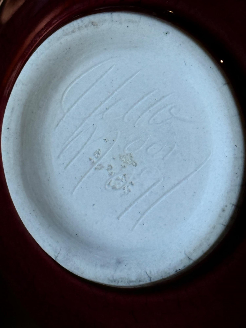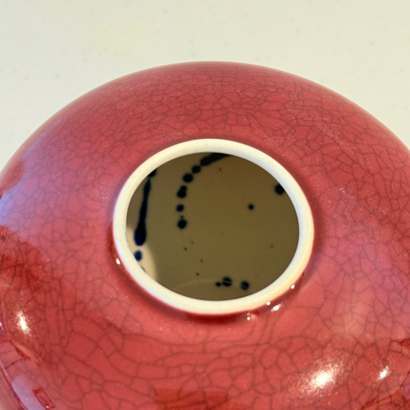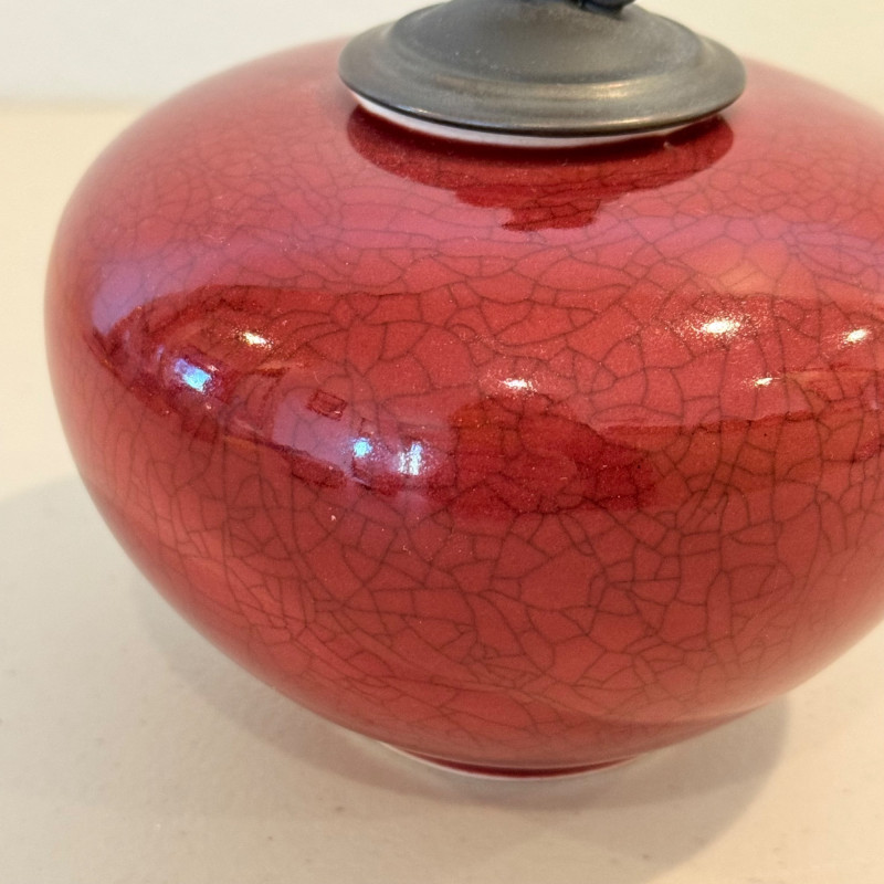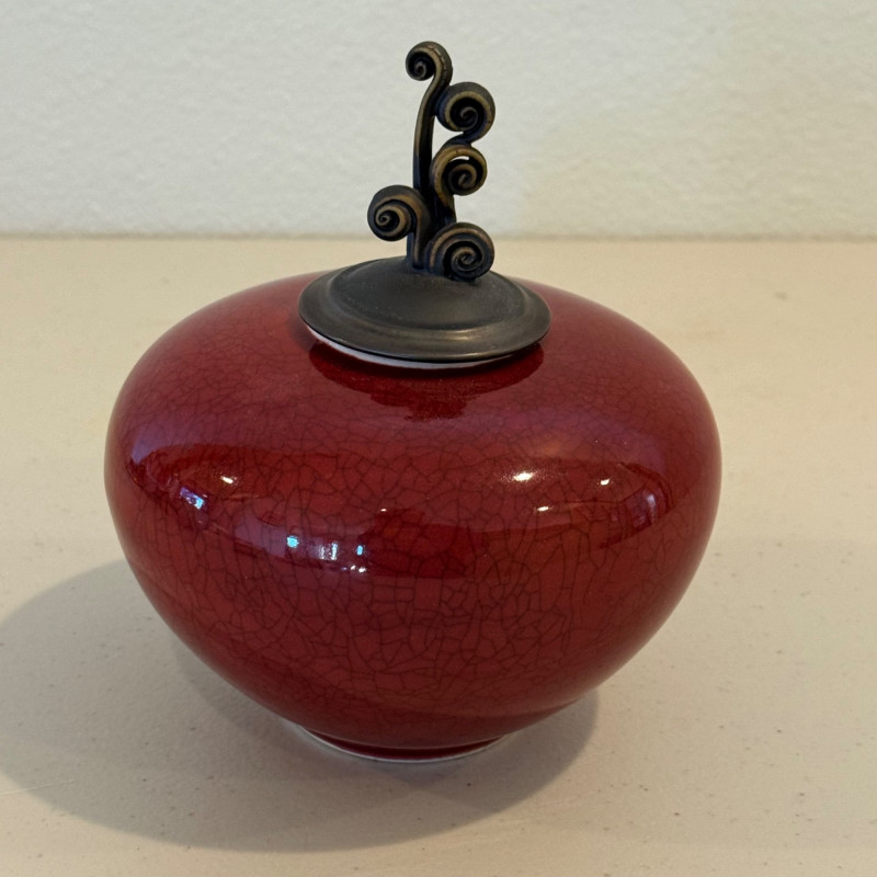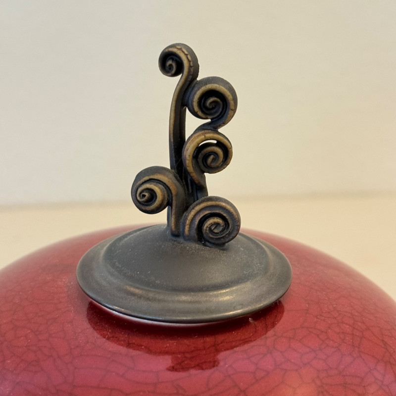 A striking studio art vase by Hello Moon Studios, featuring a rich oxblood (sang-de-boeuf) crackle glaze over porcelain. The piece has a curvaceous rounded form and is topped with a distinctive metallic sculptural lid of coiled, ascending spirals — an artistic contrast of organic and modern design. Details: Artist/Studio: Hello Moon Studios (signed and dated on base) Material: Porcelain with oxblood glaze; metal lid Finish: High-gloss with fine crackle pattern Design Notes: Elegant contemporary form; sculptural swirl finial; collectible studio pottery Collecting Note: Hello Moon Studios is known for its modern interpretations of traditional glazes, particularly oxblood and celadon tones. This example beautifully merges Asian glaze heritage with modern sculptural sensibilities, making it a standout display piece for collectors of artisan ceramics and studio pottery.Hello Moon Studios Ox Blood Glazed Porcelain Vase with Sculptural Lid