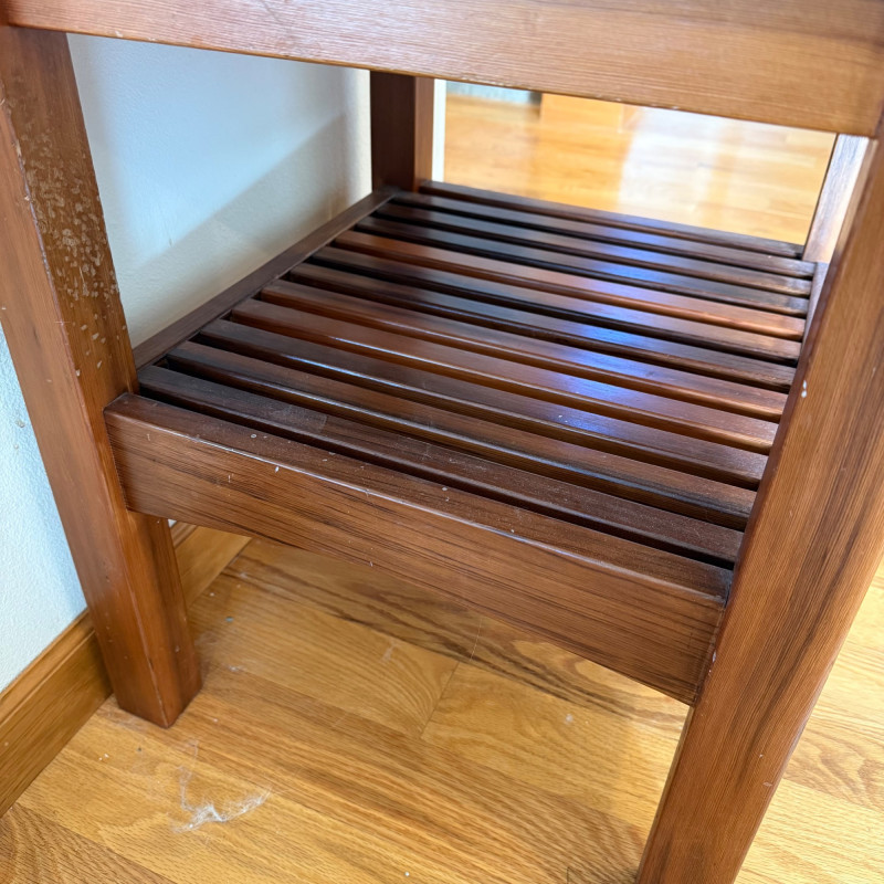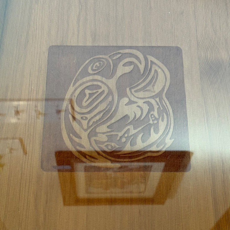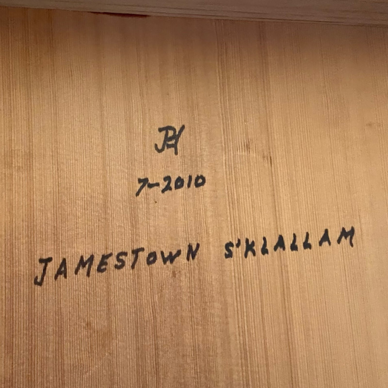 Beautifully handcrafted wood and glass side table by the Jamestown S’Klallam Tribe, dated 2010 and signed by the artisan. This piece features a tempered glass top revealing a central Northwest Coast Native motif—an engraved design inspired by traditional Salish art, possibly depicting a stylized raven or eagle. Expertly built with solid hardwood and a slatted lower shelf, this table reflects both traditional craftsmanship and modern functionality. The warm wood tones and precise joinery highlight the artisan’s skill and cultural heritage. Details: Maker: Jamestown S’Klallam Tribe (Signed and dated 2010) Material: Solid hardwood with glass top Design: Northwest Coast Native engraving at center Features: Slatted shelf below, clean Mission-style lines Collecting Note: The Jamestown S’Klallam people, based in Washington State’s Olympic Peninsula, are known for fine woodworking that honors Coast Salish art traditions. This table embodies a blend of indigenous symbolism and fine furniture craftsmanship, making it a standout piece for collectors of Native American art and Pacific Northwest design.