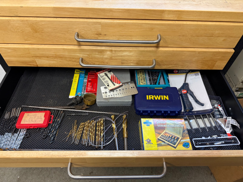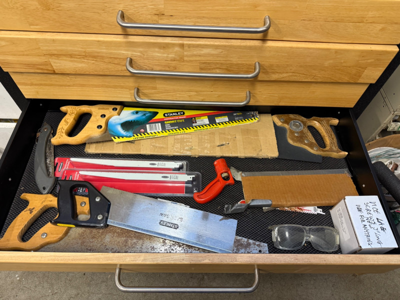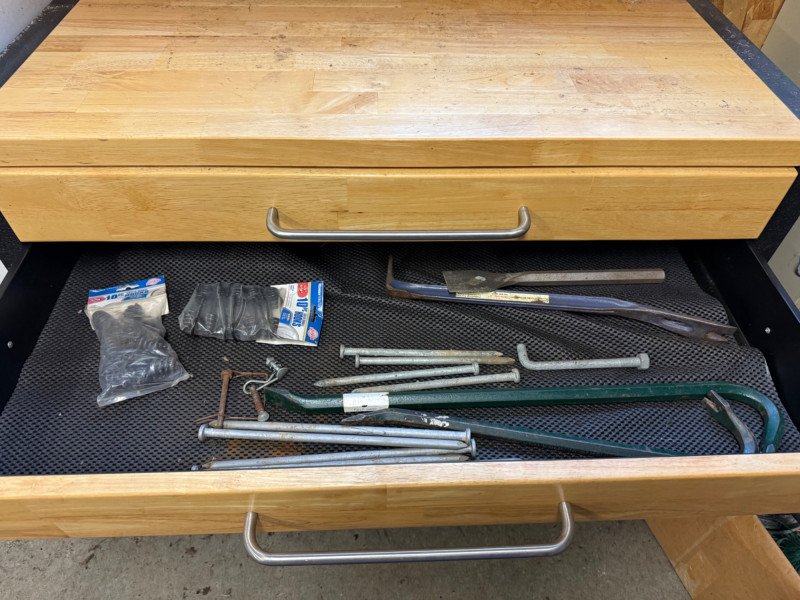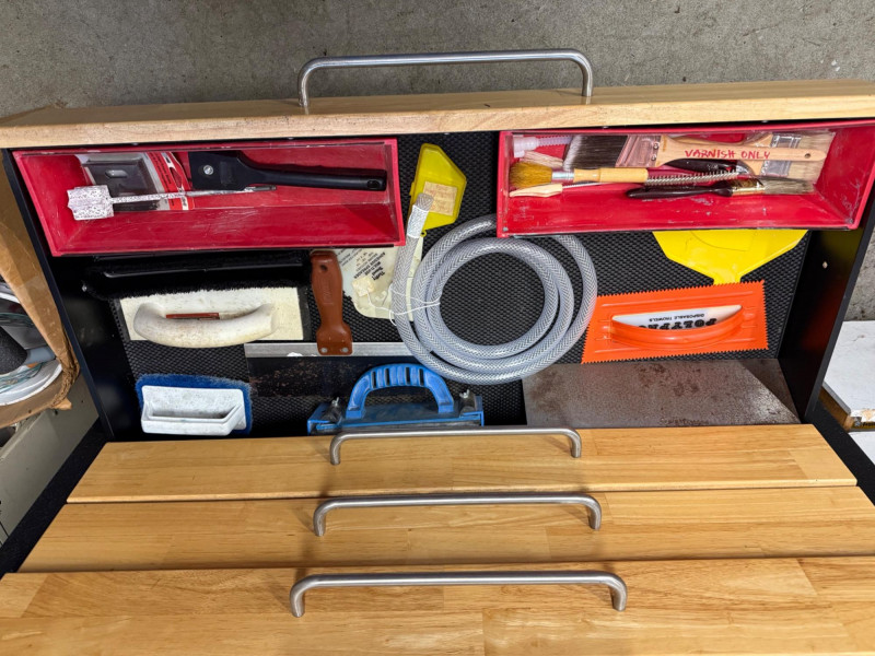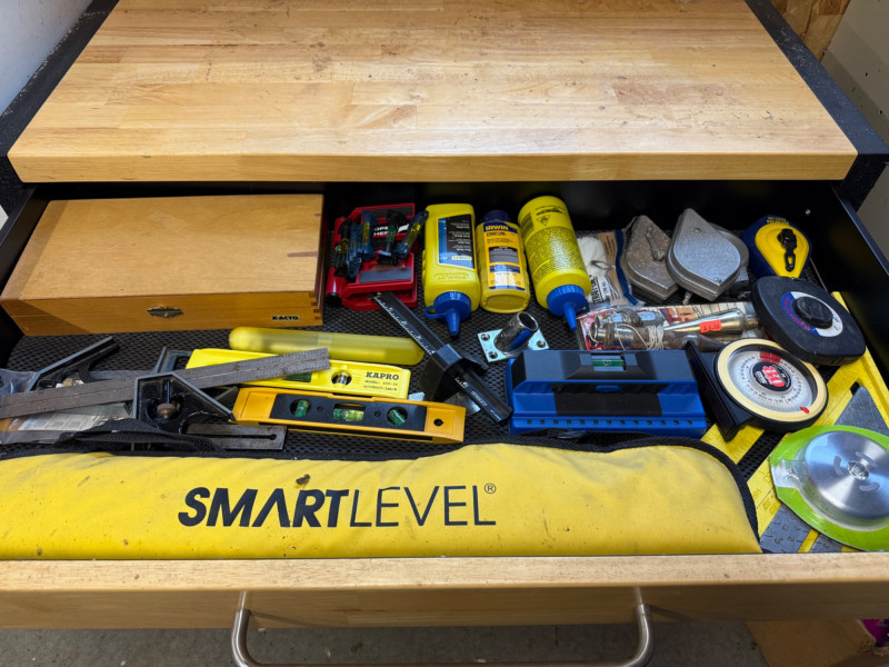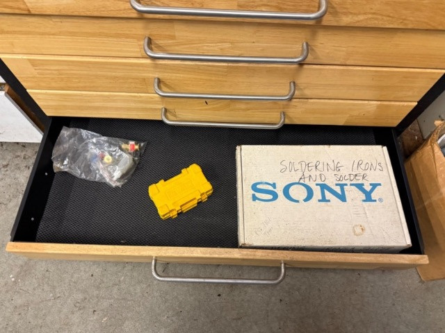 Heavy-duty Whalen workshop rolling tool chest, featuring six full-width drawers, a solid butcher-block wood top, and sturdy steel side panels with brushed metal handles. This professional-grade toolbox combines style and strength, ideal for organizing tools in a garage or workshop. Each drawer is neatly arranged with a wide variety of hand tools and accessories, including: Drawer 1: Paint and finishing tools — brushes, spreaders, trowels, hose, and accessories. Drawer 2: Assorted Stanley and other brand hand saws, miter saw, utility knives, and safety goggles. Drawer 3: Hardware and large fasteners, including clamps, bolts, hooks, and pry bars. Drawer 4: Drill bits, driver sets, and accessories — includes Irwin, General, and assorted specialty sets. Drawer 5: Electronics repair tools — Sony-labeled box with soldering irons and solder, plus connectors and cases. Maker: Whalen Furniture