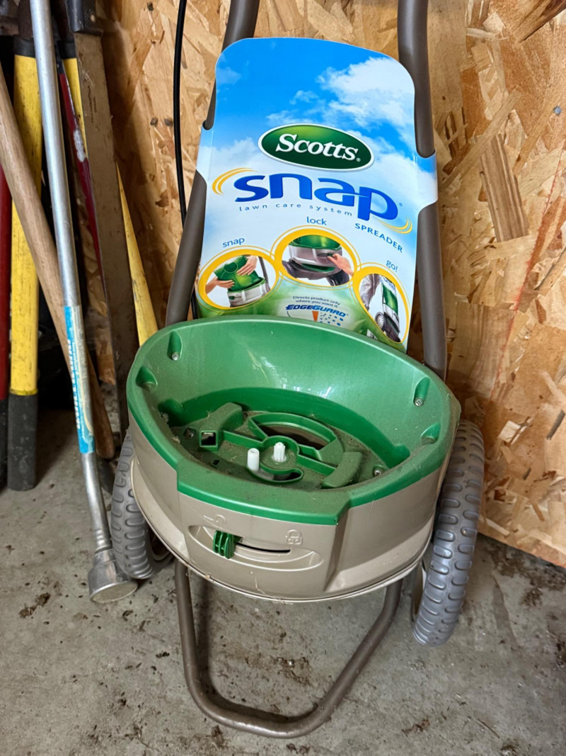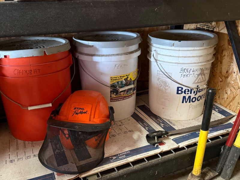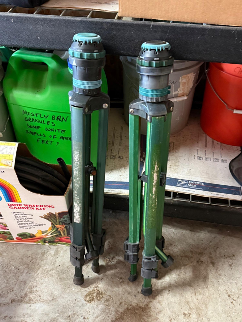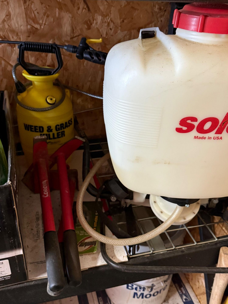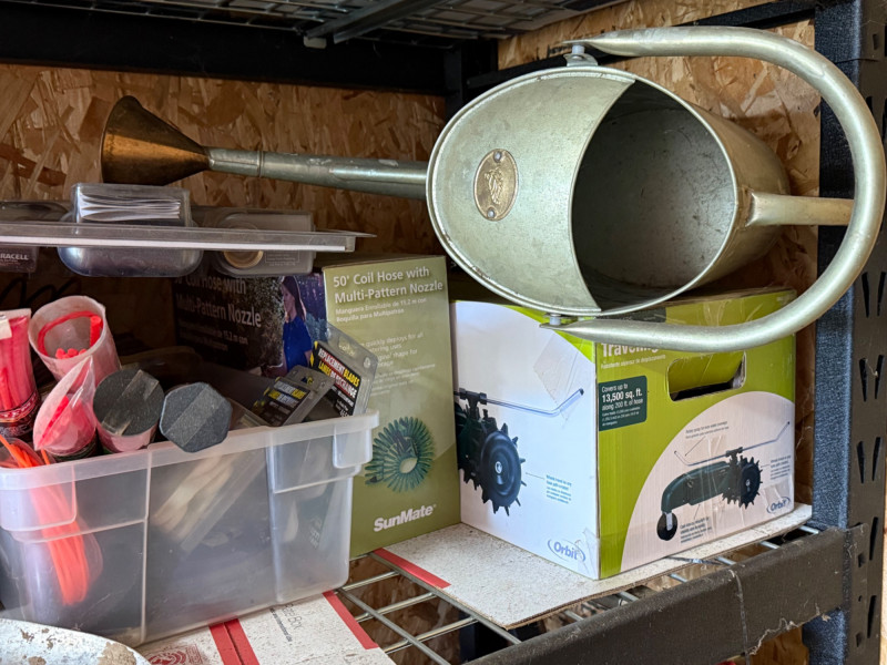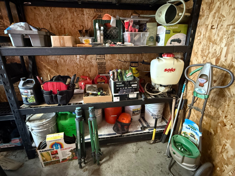 A comprehensive assortment of garden and lawn maintenance tools and supplies — ideal for hobbyists or professional landscapers alike. This collection includes a Solo backpack sprayer (Made in USA), a hand-pump weed and grass killer sprayer, and a Scotts Snap lawn care spreader with wheels and locking system. Also featured are various hand tools such as trowels, pruners, cultivators, and soil scoopers neatly organized in tool caddies and boxes. Additional highlights include: Metal watering can with classic design and brass rose Two green oscillating tripod sprinklers Buckets labeled for fertilizers and soil amendments (contents not guaranteed) Assorted hoses, connectors, and drip watering kit (Raindrip) Protective headgear (Stihl PolyMark) Various garden accessories, gloves, and supplies stored in bins and boxes Handling Note: