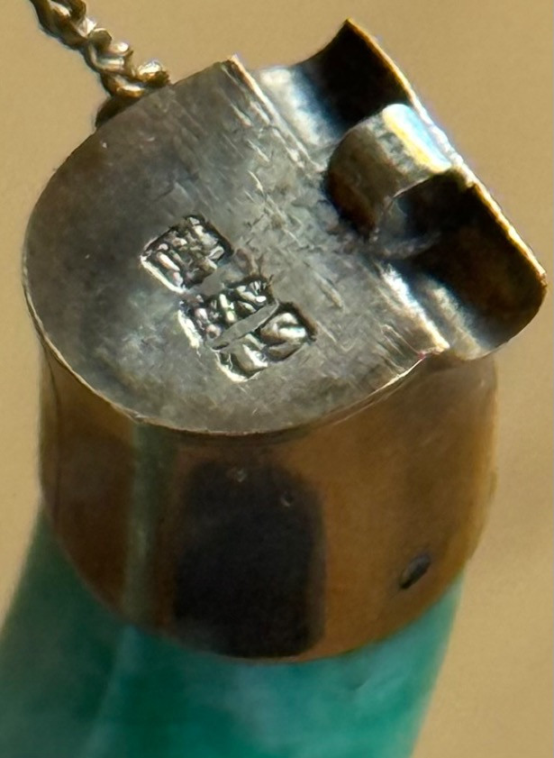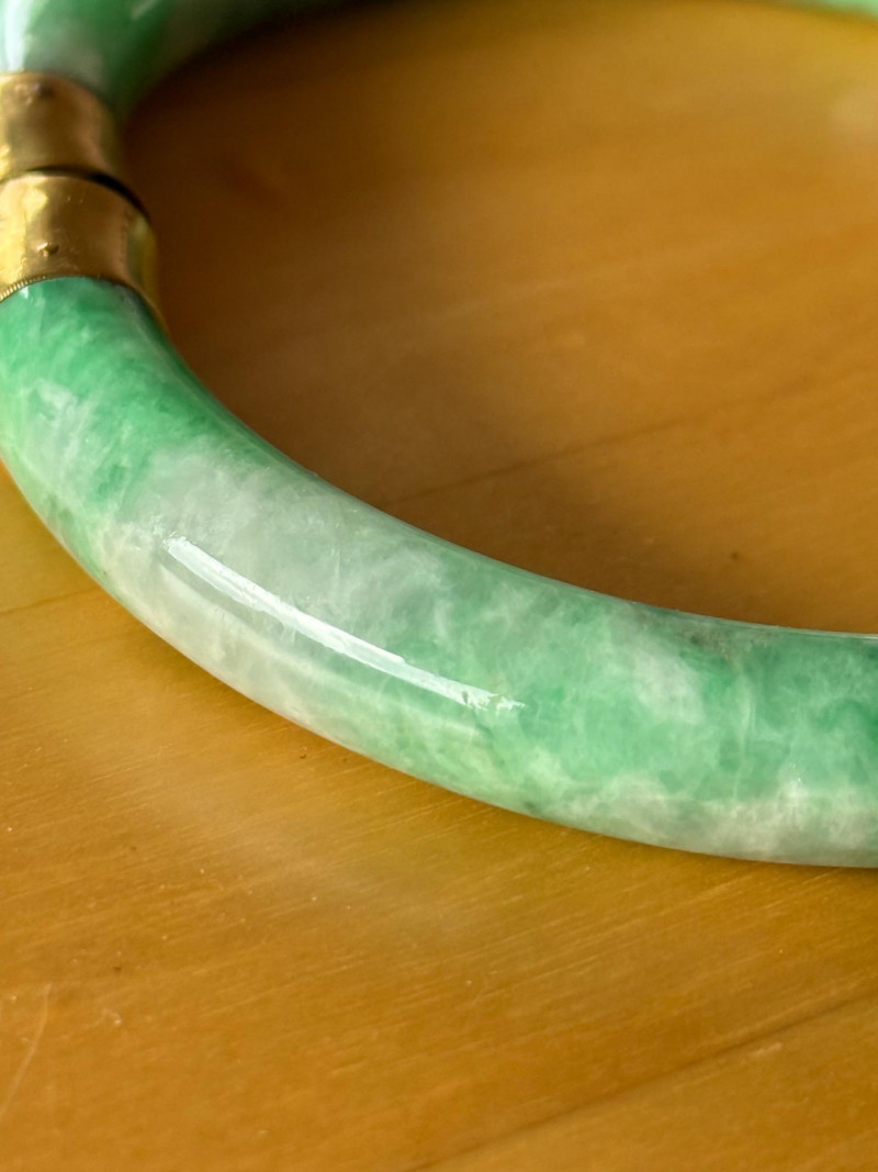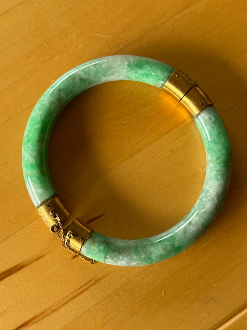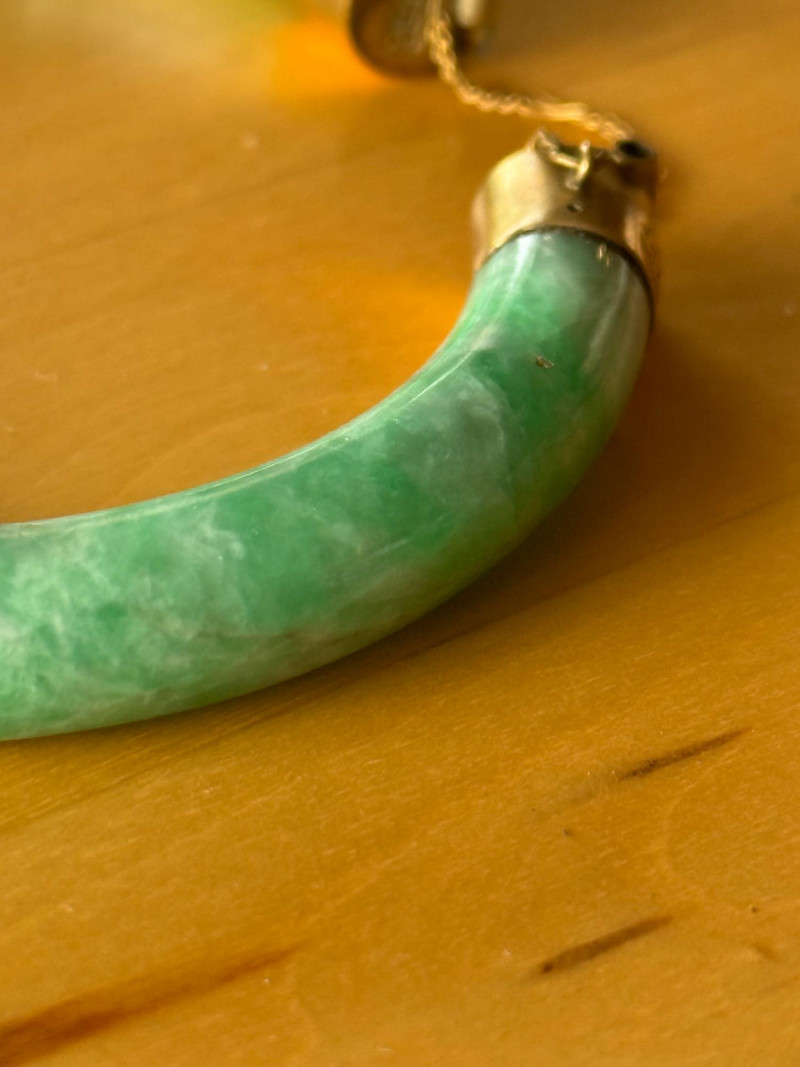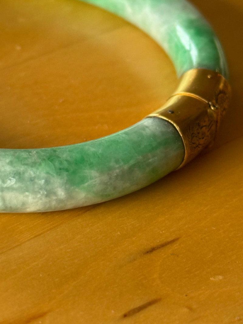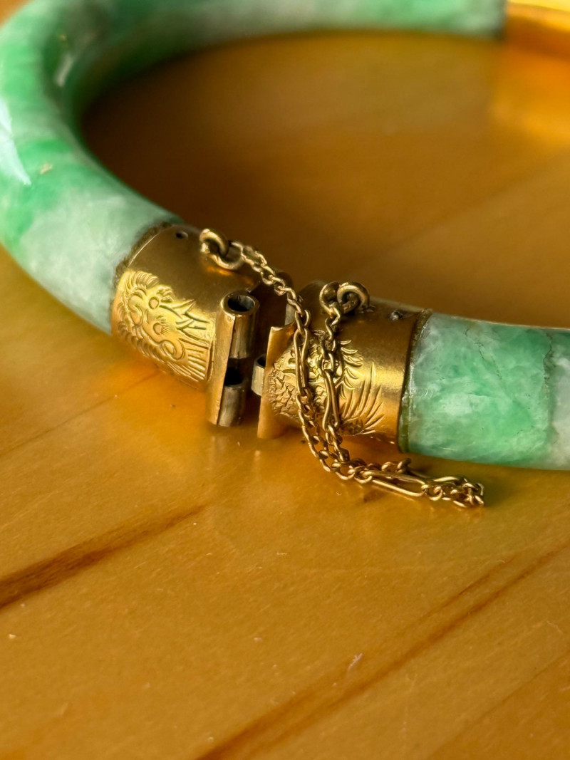 A beautifully crafted vintage Chinese jade bangle featuring vivid green and white mottled jade mounted in gold fittings intricately engraved with a dragon motif—a traditional symbol of strength, power, and good fortune. The bracelet has a secure hinged clasp with safety chain and bears a Chinese hallmark indicating gold content and maker origin. Details: Material: Natural jade (green and white mottled) Mounts: Chinese marks Motif: Engraved dragon design Interior Diameter: 2.25 inches (57 mm) Stone Width: ¼ inch (6 mm) Clasp: Hinged with safety chain Era: Mid-20th century (circa 1940s–1960s)