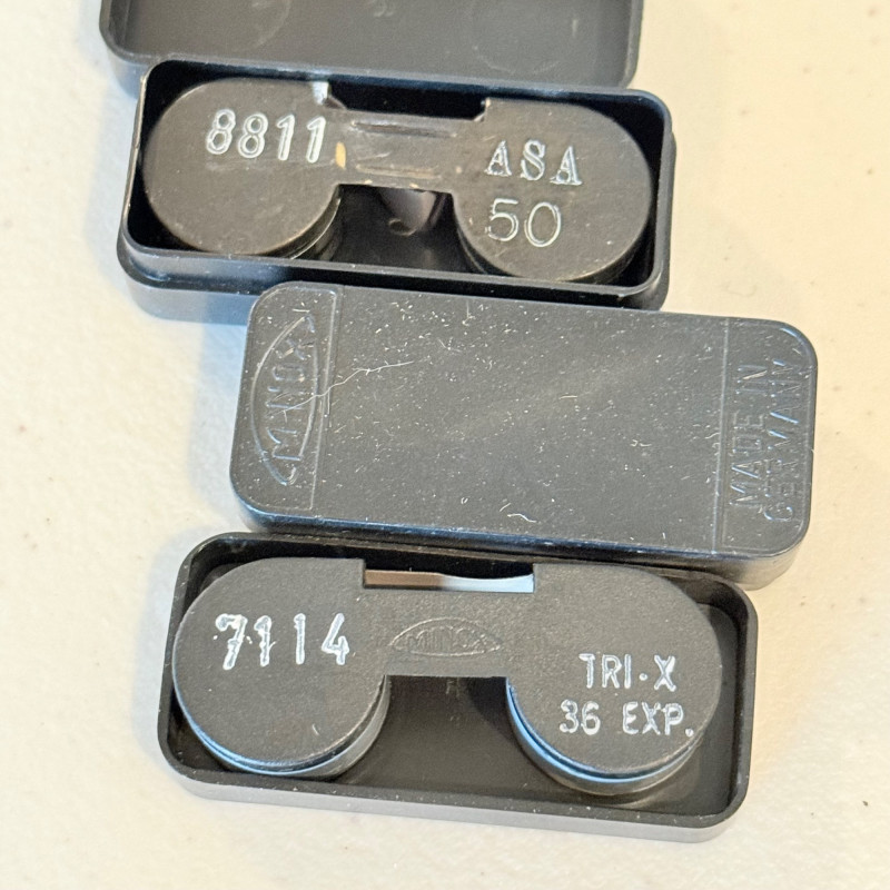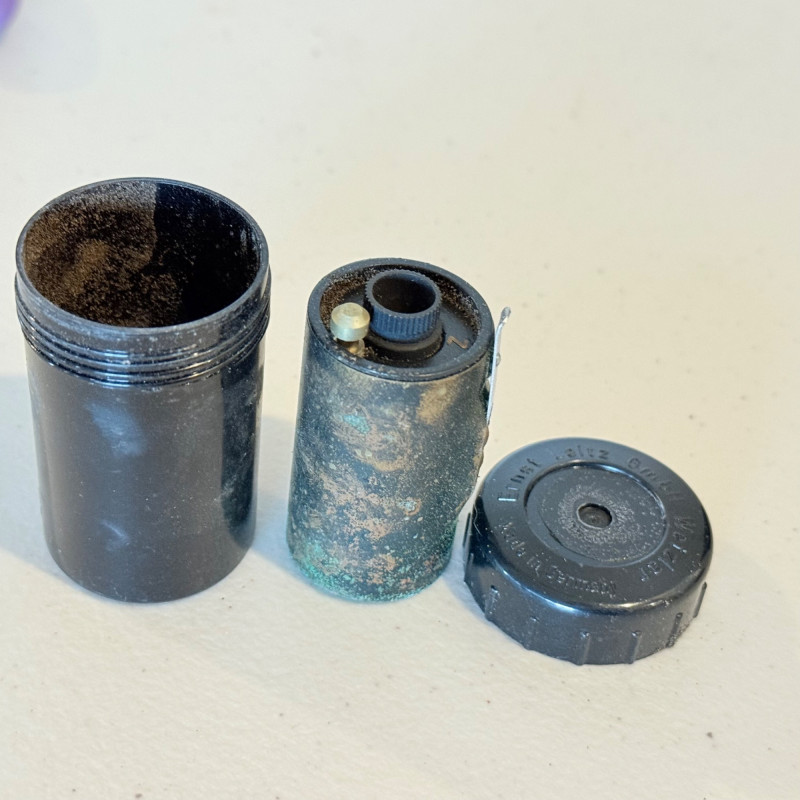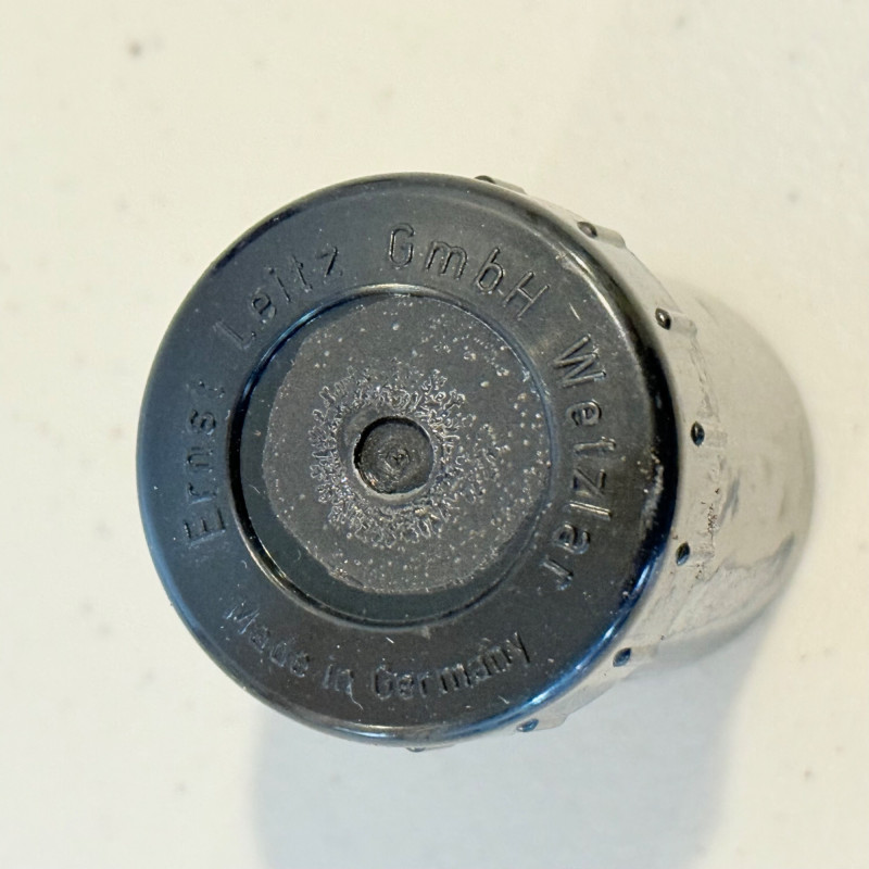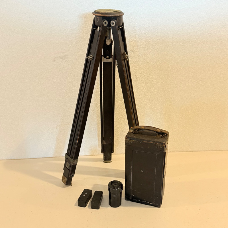 An excellent vintage German photographic set featuring an Ernst Leitz GmbH Wetzlar tripod, known for its precision engineering and connection to Leica camera systems. The sturdy black metal tripod adjusts smoothly from 17 inches to 42 inches tall, with locking mechanisms and rubber-capped feet for stable positioning. The top platform retains its original felt pad and central mounting screw hole, ideal for vintage cameras or optical devices. Included with the tripod are two Minox film canisters (marked Made in Germany, labeled “ASA 50” and “Tri-X 36 EXP”) and an Ernst Leitz Wetzlar metal film container also stamped Made in Germany. A compact metal storage caseaccompanies the lot, completing this collectible set. Maker: Era: