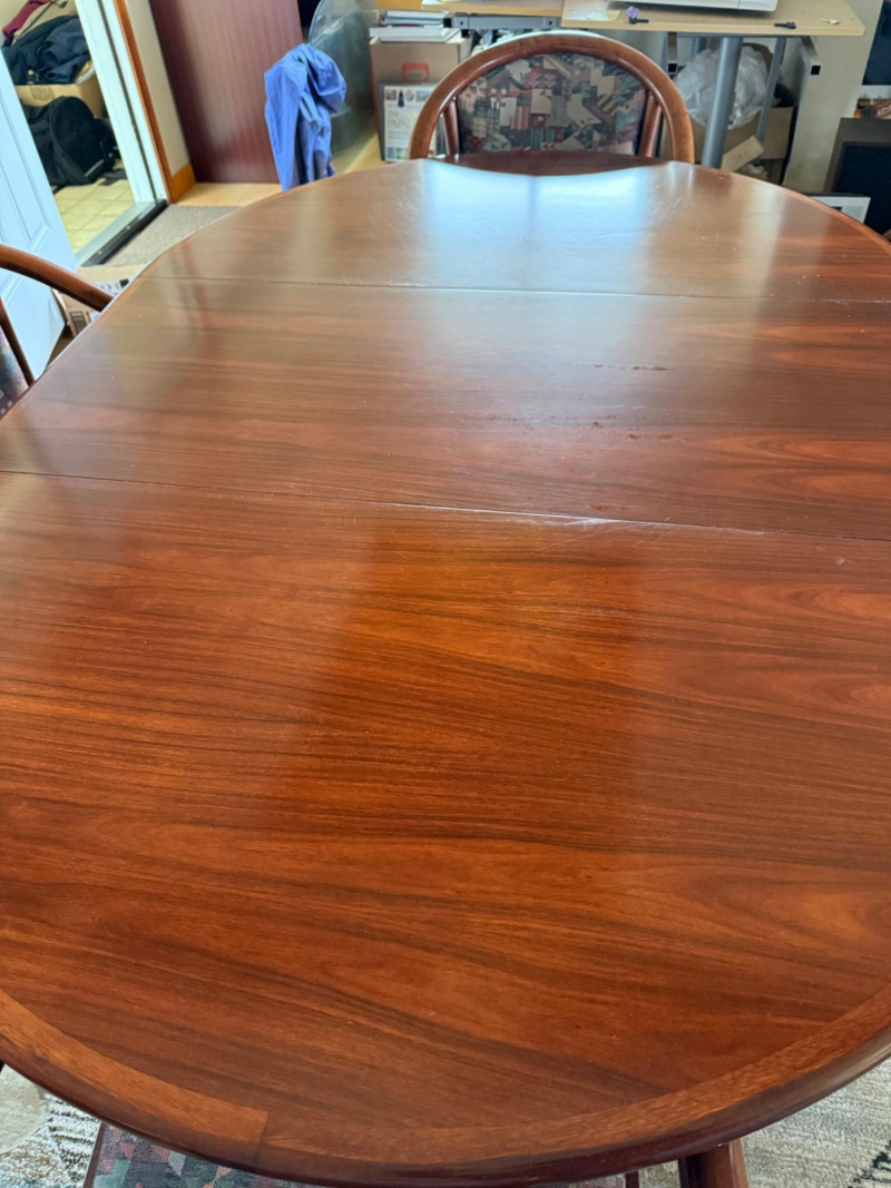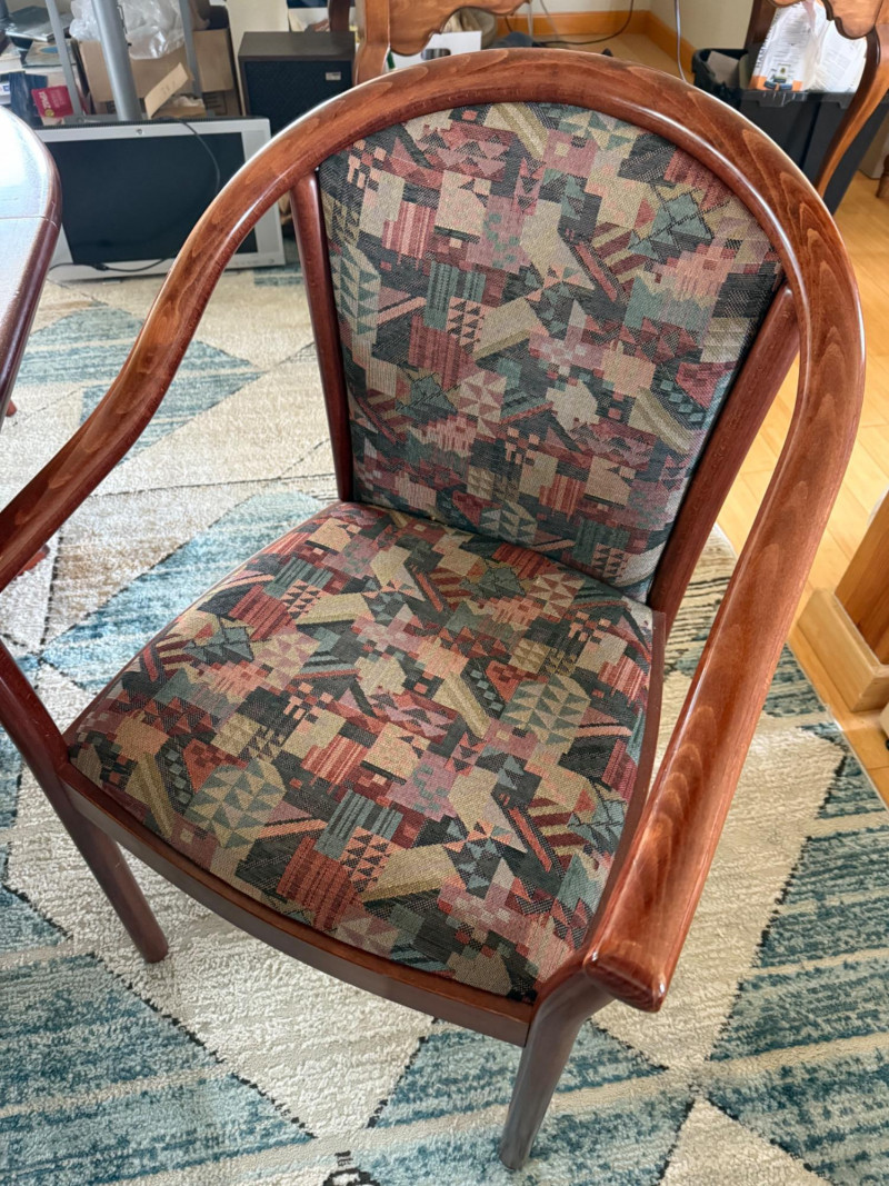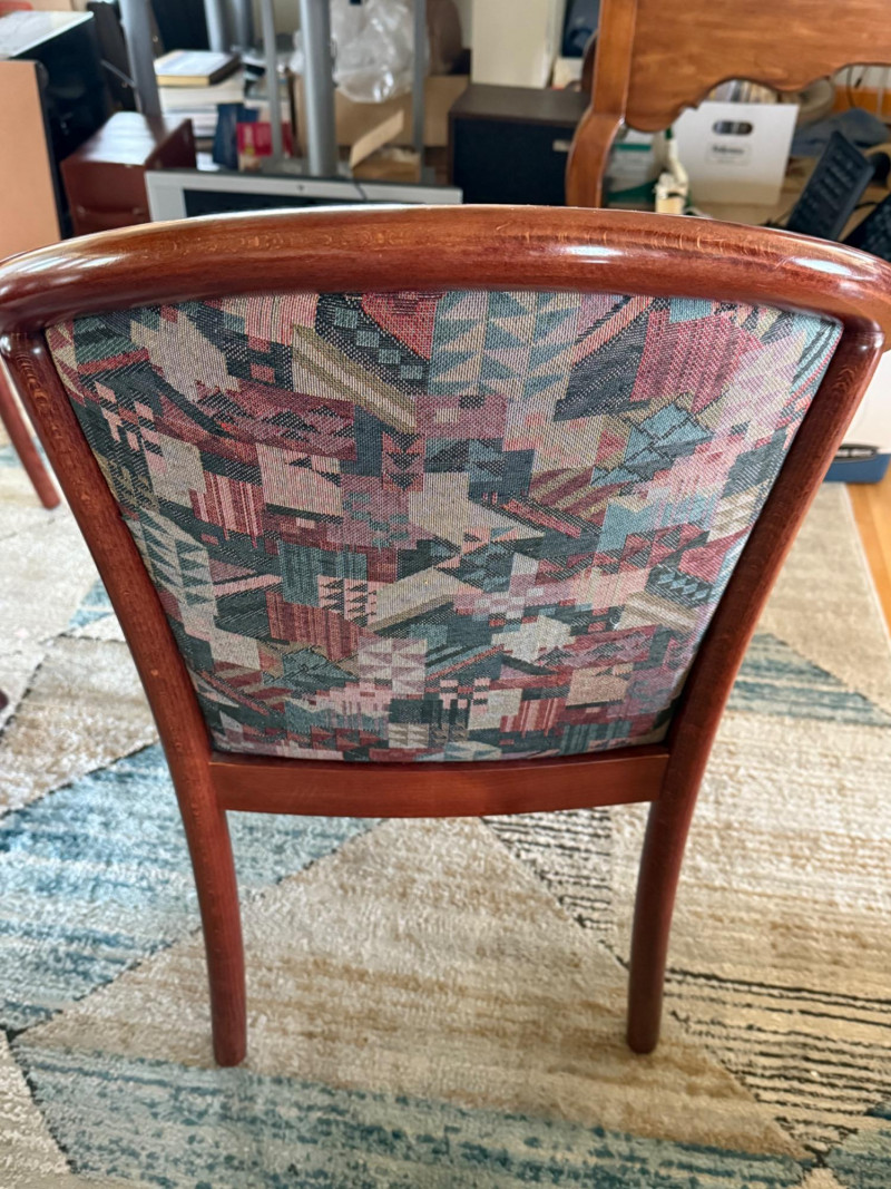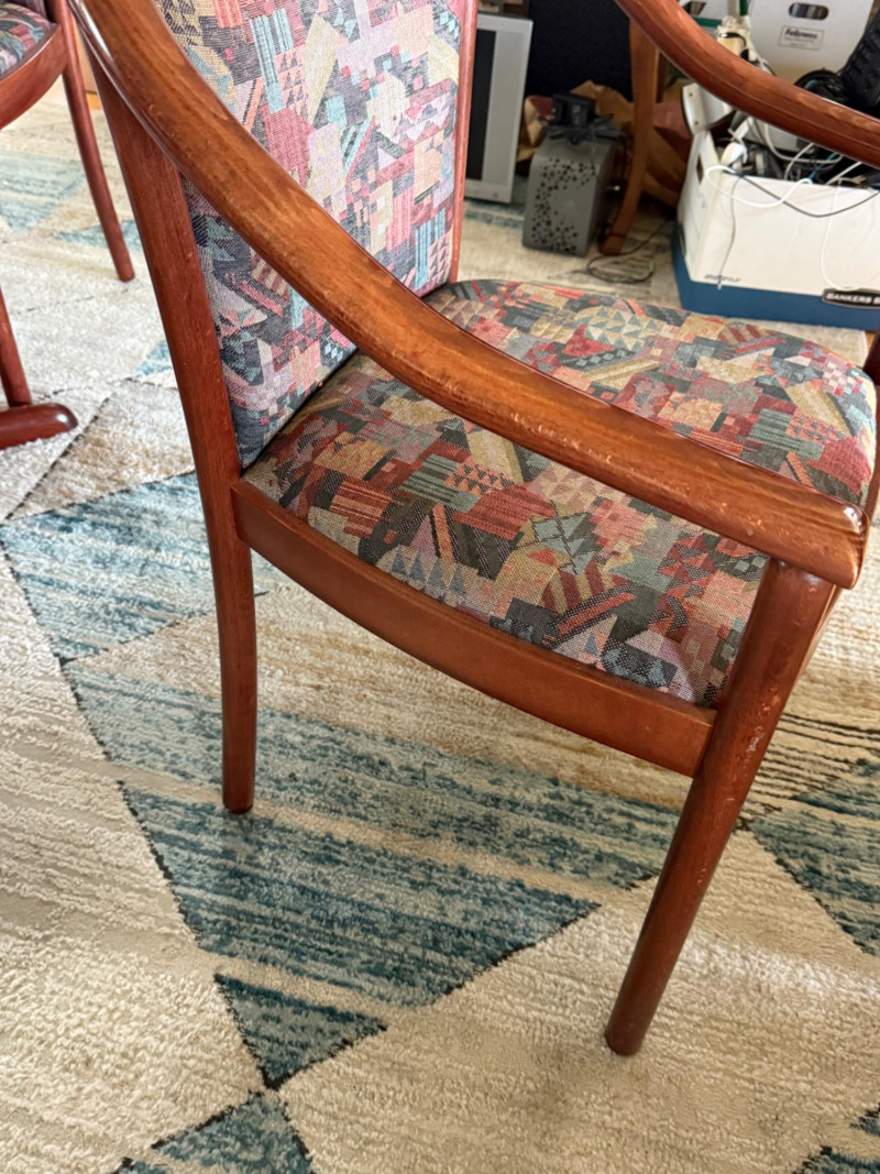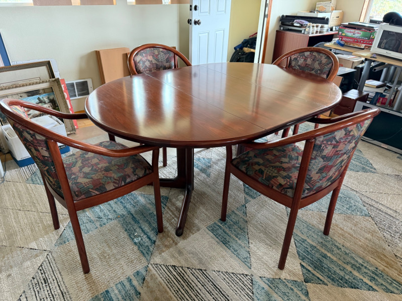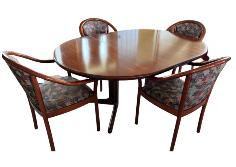 Maker: Skovby Møbelfabrik, Denmark Accompanied by four matching armchairs, each made in Italy by IMS SRL and upholstered in a geometric multi-tone fabric characteristic of late-20th-century European design. The chairs feature gently curved backs and rounded arms that complement the table’s sculpted edge and warm tone. Dimensions: Table: 67.5” W × 48” D × 28” H Leaf: 19½” W (extends total length to approx. 87”) Chairs: 34” H × 22” W × 18” D Collecting Note: